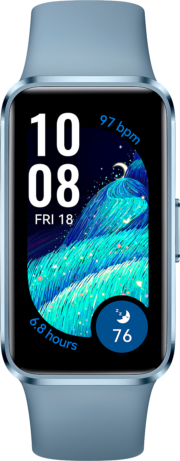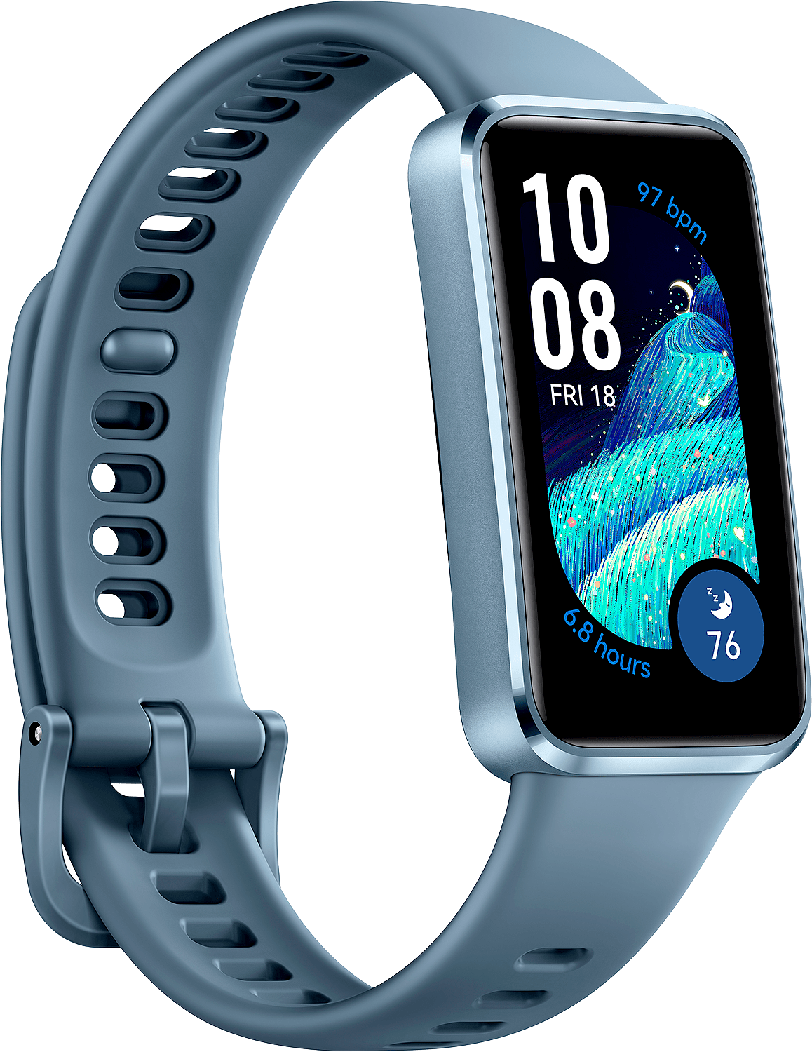 Koe kokopäiväinen mukavuus HUAWEI Band 10:n ohuen (8,99 mm) profiilin ja kevyen (15 g) painon ansiosta. Suunniteltu ilmavaksi ja yhdistetty ihoystävällisiin fluoroelastomeerirannekkeisiin, tätä älykelloa voi käyttää jatkuvasti ilman epämukavuutta, oletpa sitten aktiivinen tai lepäät.