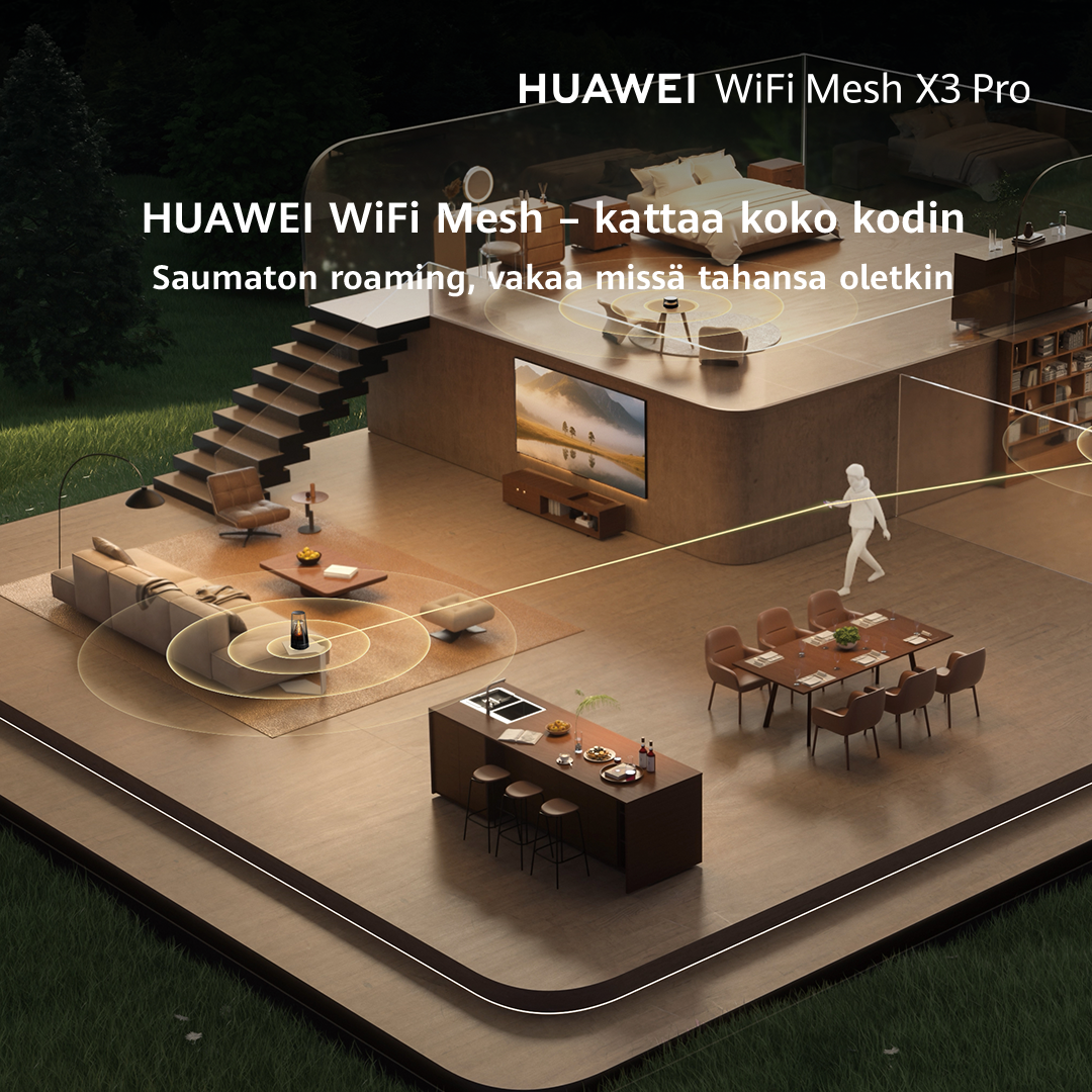 HUAWEI WiFi Mesh+ -teknologian ansiosta laitteesi pysyvät aina yhteydessä parhaaseen saatavilla olevaan signaaliin. Kun liikut huoneesta toiseen, laite vaihtaa välittömästi vahvimpaan tukiasemaan, tarjoten saumattoman verkkovierailun alle 50 ms viiveellä.