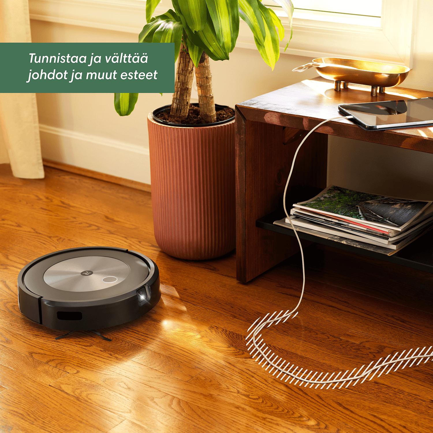 PrecisionVision-navigaation avulla Roomba® j7 -robotti-imuri tunnistaa ja kiertää esteet, kuten lemmikin jätökset ja sähköjohdot, ja vie siivousurakan loppuun.