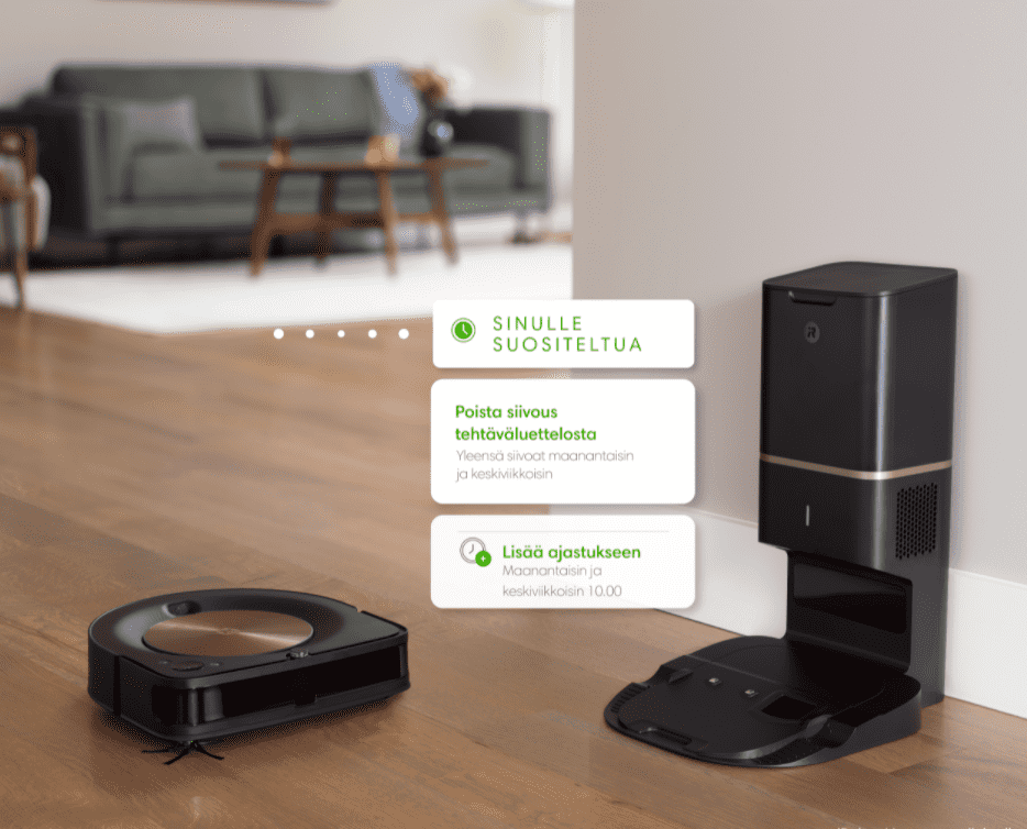 Tyhjentää automaattisesti robotin pölysäiliön hävitettävään pussiin, johon mahtuu 30 säiliöllistä likaa, pölyä ja hiuksia. Voit siis unohtaa imuroinnin viikoiksi.