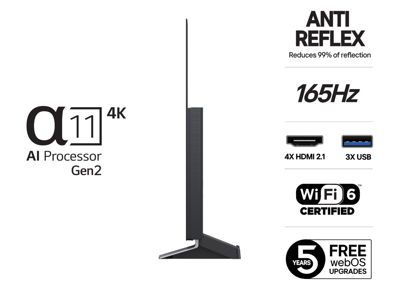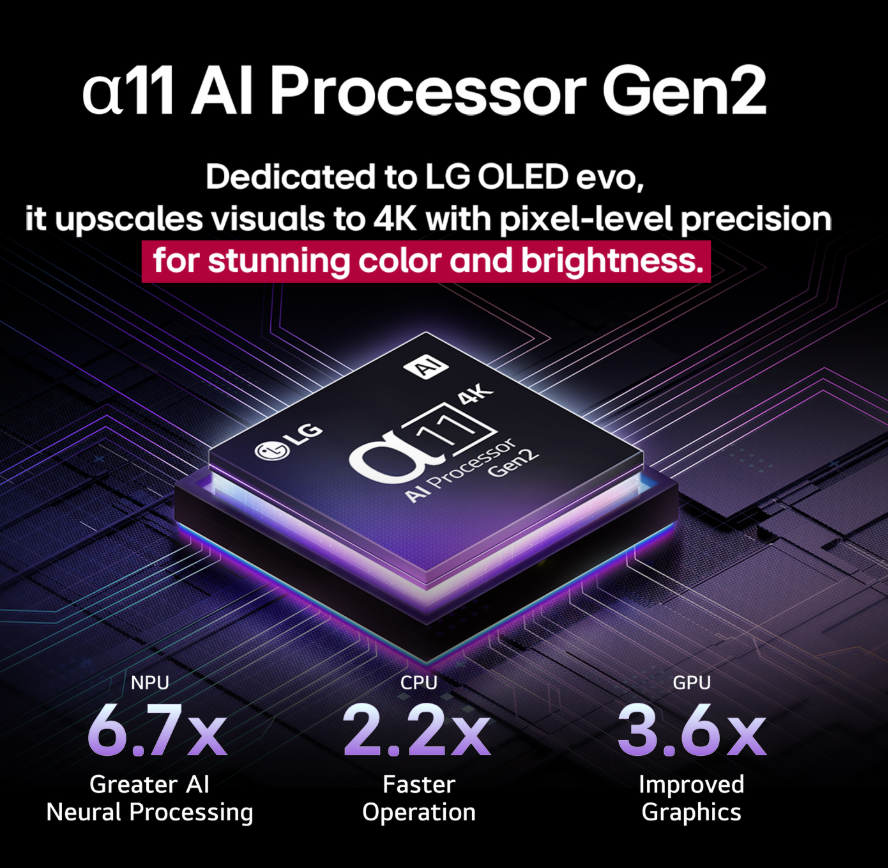 OLED G5:n ytimessä toimii LG:n edistynein α11 AI Processor 4K. Se optimoi kuvan ja äänen sisällön mukaan, parantaa yksityiskohtia ja säätää ääntä reaaliaikaisesti. Olipa kyseessä elokuva, urheilulähetys tai dokumentti, jokainen ruutu on viimeistelty huippulaadulla.