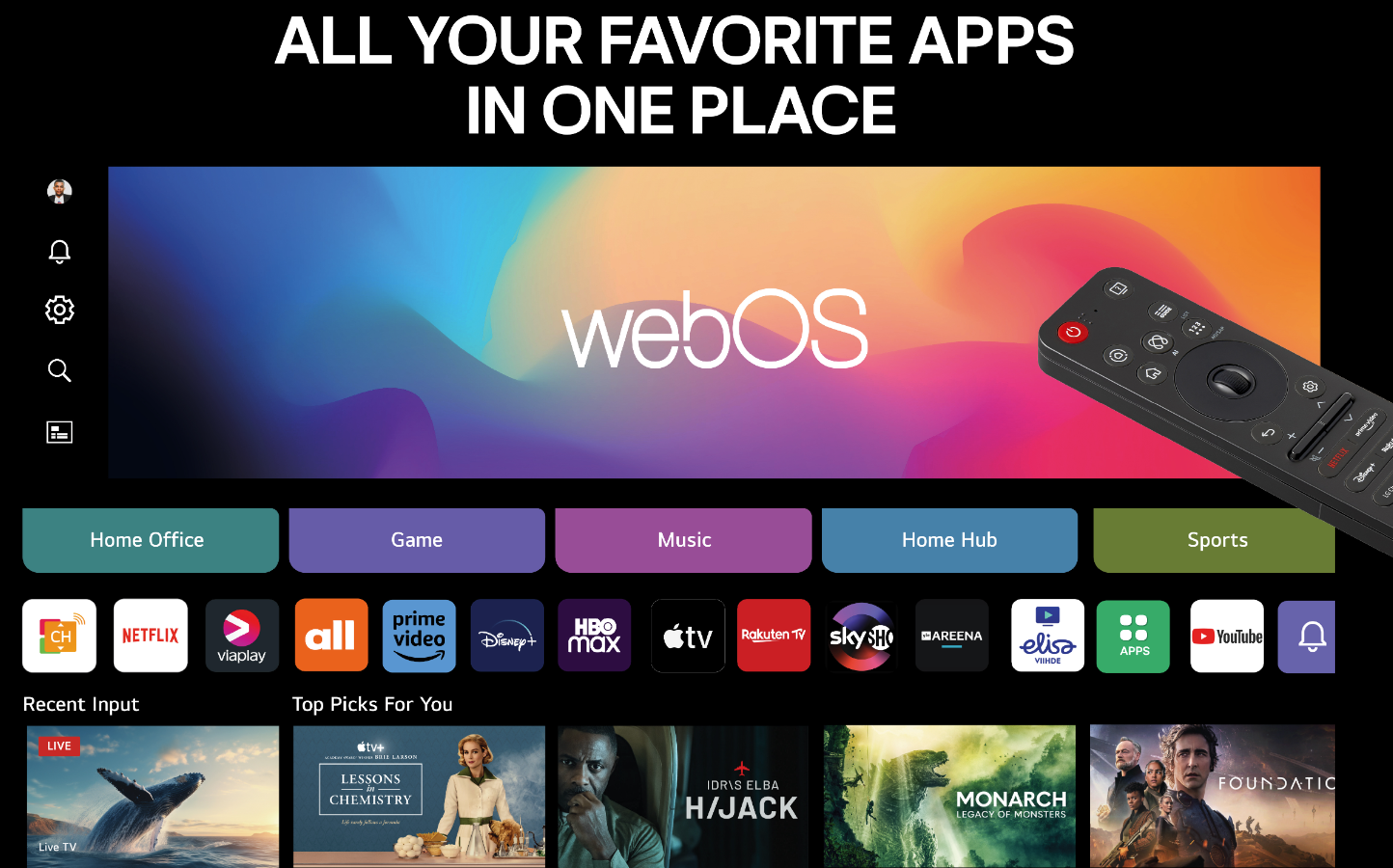 webOS tarjoaa selkeän ja käyttäjäystävällisen käyttöliittymän, joka mukautuu käyttäjän mieltymyksiin. Jopa 10 erillistä käyttäjäprofiilia mahdollistaa yksilöllisen katselukokemuksen koko perheelle. webOS re:new -ominaisuus takaa järjestelmäpäivitykset viiden vuoden ajan, pitäen television ajan tasalla pitkään.