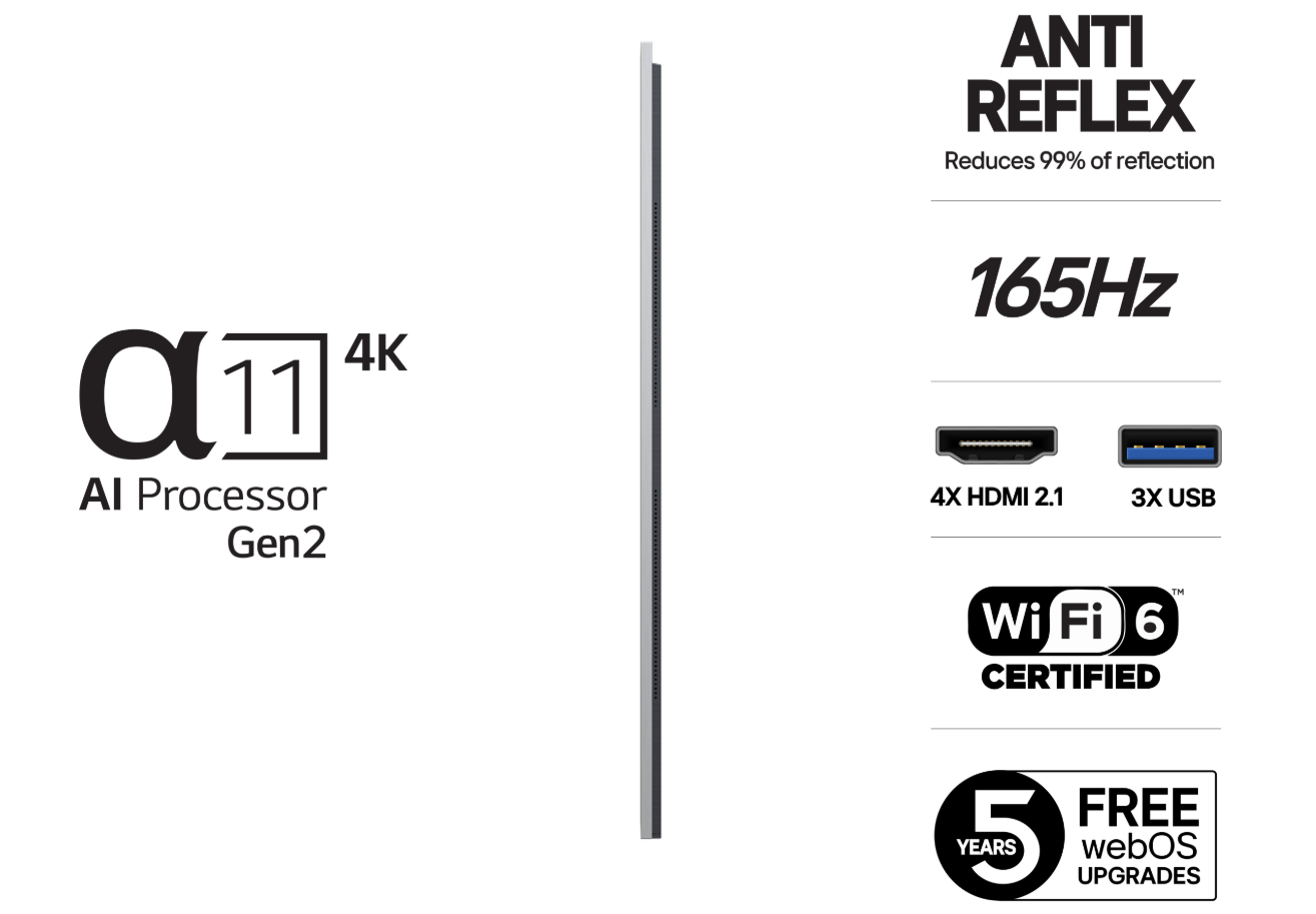 165 Hz:n virkistystaajuus, G-Sync- ja FreeSync-tuki sekä 0,1 ms:n vasteaika tekevät G5:stä täydellisen valinnan pelaajille. Game Optimizer ja Dashboard mahdollistavat asetusten säätämisen lennossa, ja OLED-kuvanlaatu tekee pelikokemuksesta entistä syvemmän.