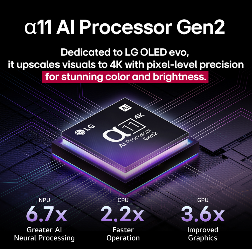 OLED G5:n ytimessä toimii LG:n edistynein α11 AI Processor 4K. Se optimoi kuvan ja äänen sisällön mukaan, parantaa yksityiskohtia ja säätää ääntä reaaliaikaisesti. Olipa kyseessä elokuva, urheilulähetys tai dokumentti, jokainen ruutu on viimeistelty huippulaadulla.