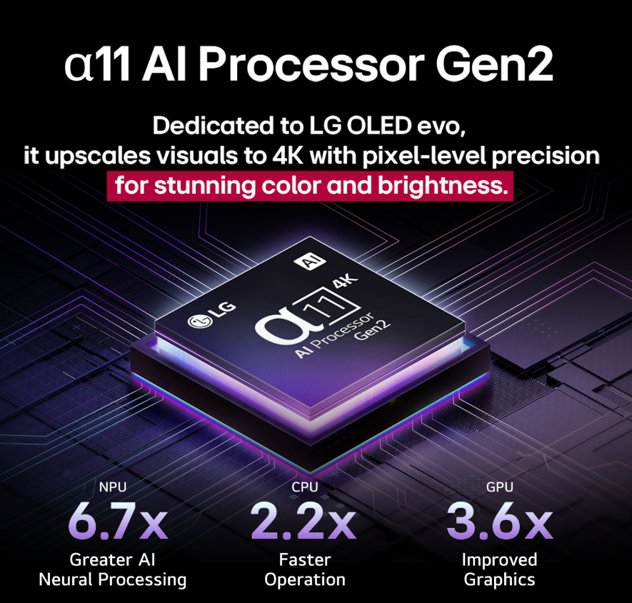 OLED G5:n ytimessä toimii LG:n edistynein α11 AI Processor 4K. Se optimoi kuvan ja äänen sisällön mukaan, parantaa yksityiskohtia ja säätää ääntä reaaliaikaisesti. Olipa kyseessä elokuva, urheilulähetys tai dokumentti, jokainen ruutu on viimeistelty huippulaadulla.