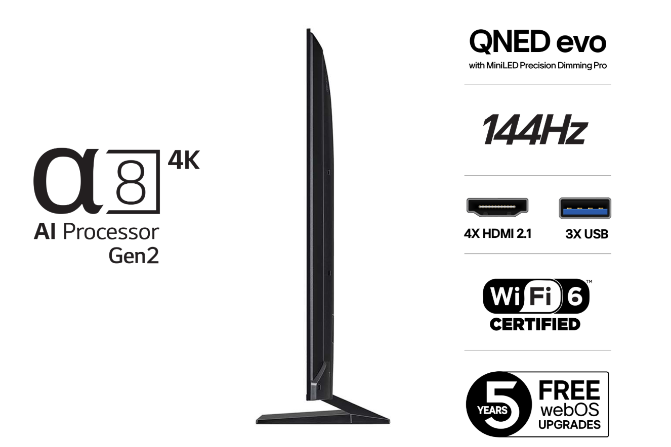 LG QNED 93 yhdistää QNED evo -näyttöteknologian, α8 AI Processor 4K -prosessorin ja Dynamic Tone Mapping Pro -toiminnon tarjoten poikkeuksellisen väritarkkuuden, syvän kontrastin ja mukaansatempaavan katselukokemuksen. Tämä televisio on suunniteltu viihteeseen, pelaamiseen ja älykkääseen arkeen.