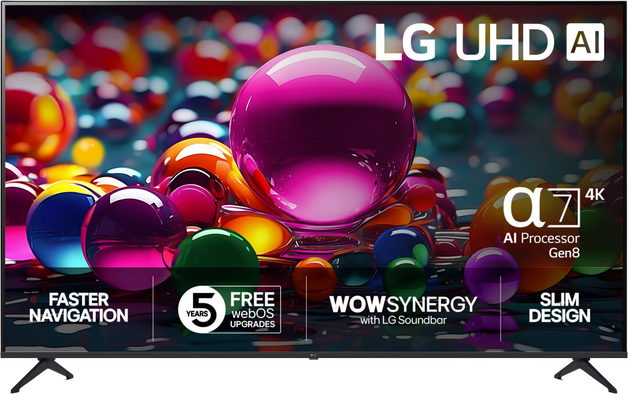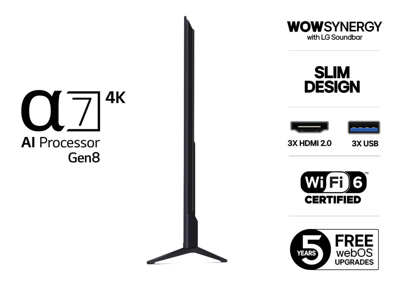 LG UA75 on suunniteltu tarjoamaan laadukas katselukokemus modernissa ja tilaa säästävässä muodossa. Sen 4K HDR -tarkkuus, päivitetty α7 AI Processor 4K Gen8 ja webOS-käyttöjärjestelmä tekevät siitä erinomaisen valinnan niin suoratoistoon, elokuvien katseluun kuin älylaitteiden hallintaan. Magic Remote -yhteensopivuus ja laaja tuki kodin älytoiminnoille tekevät käytöstä sujuvaa ja intuitiivista.