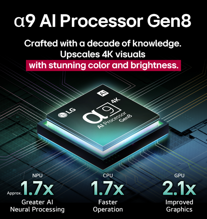 Television ytimessä toimii α9 AI Processor 4K, joka on suunniteltu erityisesti OLED-näytöille. Se optimoi kuvan ja äänen reaaliaikaisesti sisällön mukaan, parantaen kontrastia, värejä ja yksityiskohtia automaattisesti.
