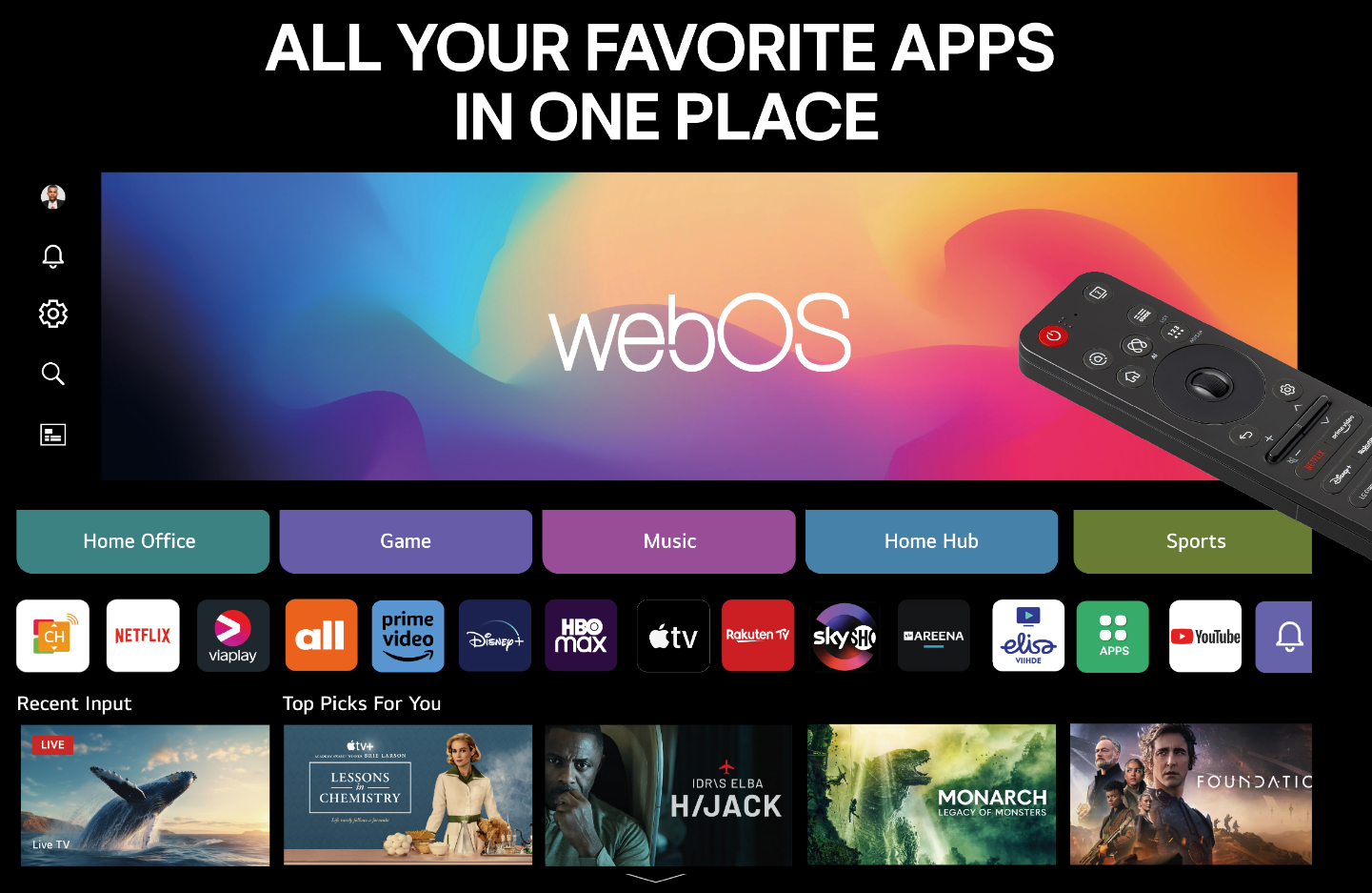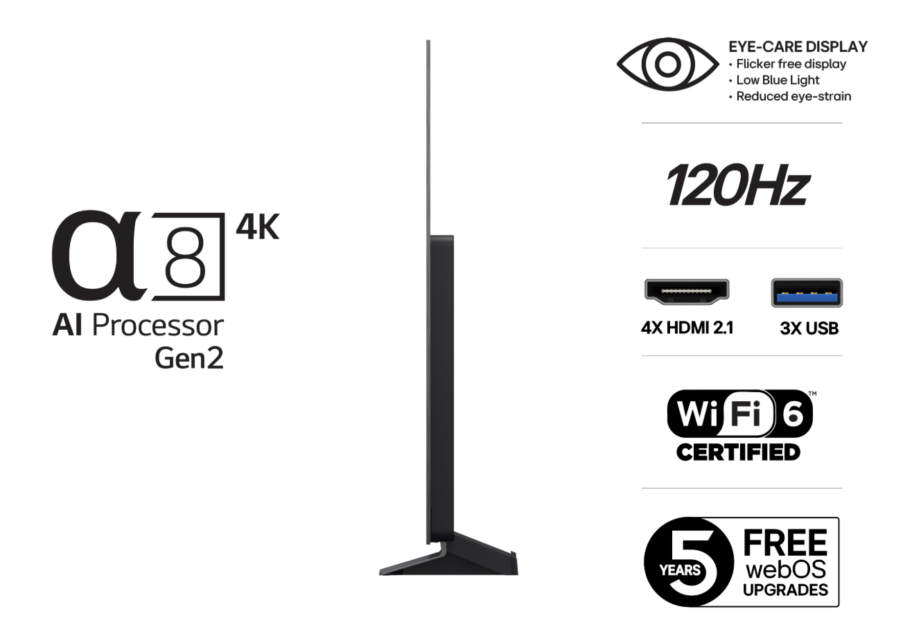 webOS tarjoaa selkeän ja käyttäjäystävällisen käyttöliittymän, joka mukautuu käyttäjän mieltymyksiin. Jopa 10 erillistä käyttäjäprofiilia mahdollistaa yksilöllisen katselukokemuksen koko perheelle. webOS re:new -ominaisuus takaa järjestelmäpäivitykset viiden vuoden ajan, pitäen television ajan tasalla pitkään.