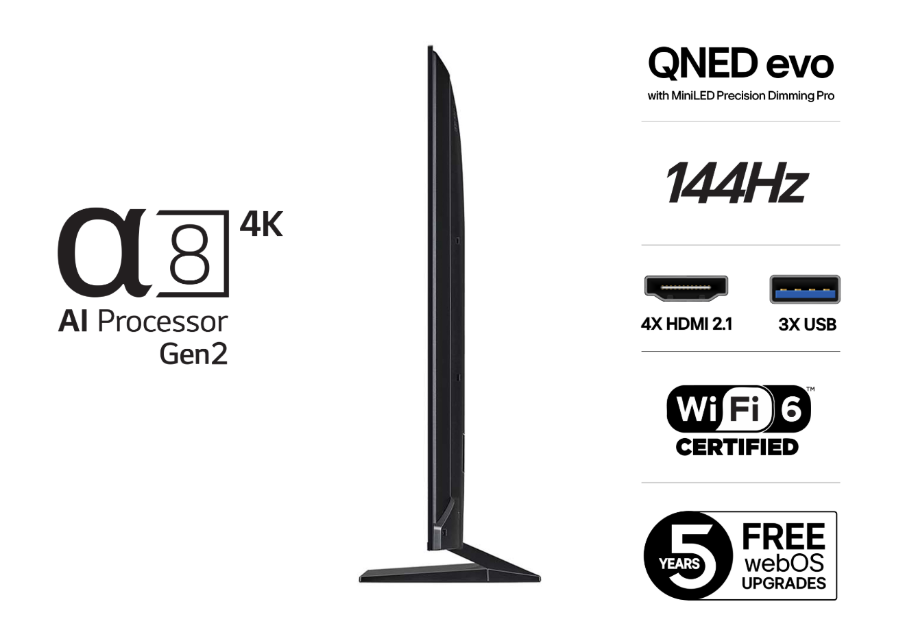 LG QNED 93 yhdistää QNED evo -näyttöteknologian, α8 AI Processor 4K -prosessorin ja Dynamic Tone Mapping Pro -toiminnon tarjoten poikkeuksellisen väritarkkuuden, syvän kontrastin ja mukaansatempaavan katselukokemuksen. Tämä televisio on suunniteltu viihteeseen, pelaamiseen ja älykkääseen arkeen.