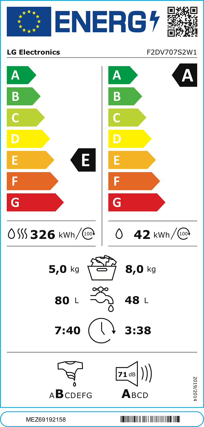 Energiatehokkuusluokka: A (pesu)/E (kuivaus)