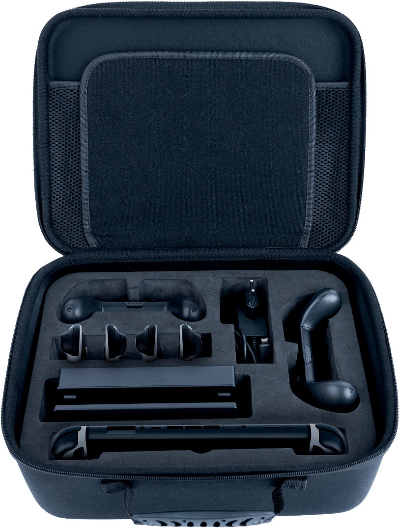 Tilaa kaikille tärkeimmille tarvikkeille Koteloon mahtuu jopa kaksi PRO-ohjainta, neljä Joy-Con-paria, virtalähde, HDMI-kaapeli sekä kymmenen pelikasettia. Jokaiselle osalle on oma paikkansa, mikä pitää varusteet järjestyksessä ja helposti saatavilla.