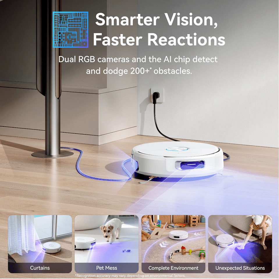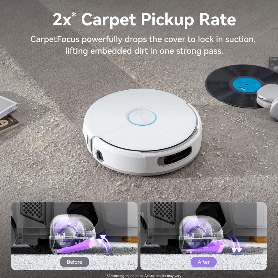 120 päivän pölypussikapasiteetti minimoi tyhjennystarpeet, ja sekä pääharja että moppi nousevat automaattisesti eri tilanteissa. Hiljainen 56-60 dB käyntiääni mahdollistaa siivouksen milloin tahansa. 11 tuuman ohut telakka ja 95 mm robottikorkeus helpottavat sijoittamista ja pääsyä esimerkiksi sohvan ja sängyn alle.