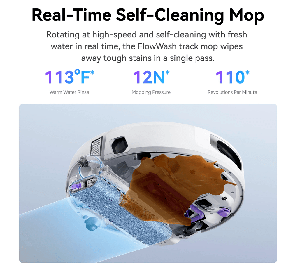 FlowWash-moppijärjestelmä puhdistaa lattiat reaaliaikaisella moppien itsepesulla ja 45 °C lämmitetyllä vedellä, joka irrottaa vaikeatkin tahrat. 12 N alaspainovoima ja 80 RPM pyörimisnopeus tehostavat puhdistusta kovilla pinnoilla. EdgeReach-sivuttaislaajennus ulottaa mopin 48 mm sivulle, jolloin myös reunat ja kulmat saavat perusteellisen käsittelyn. Robotti havaitsee likaiset kohdat ja tekee automaattisen uudelleenpesun, mikä takaa tasaisen lopputuloksen.