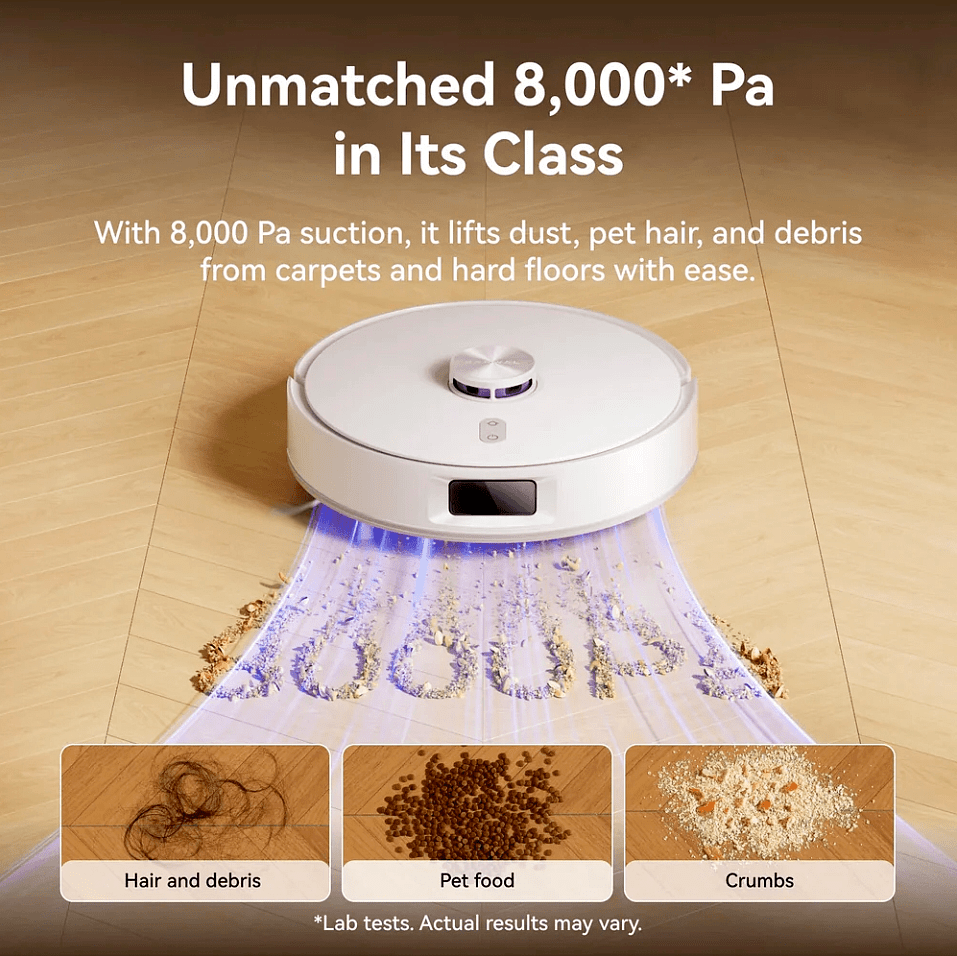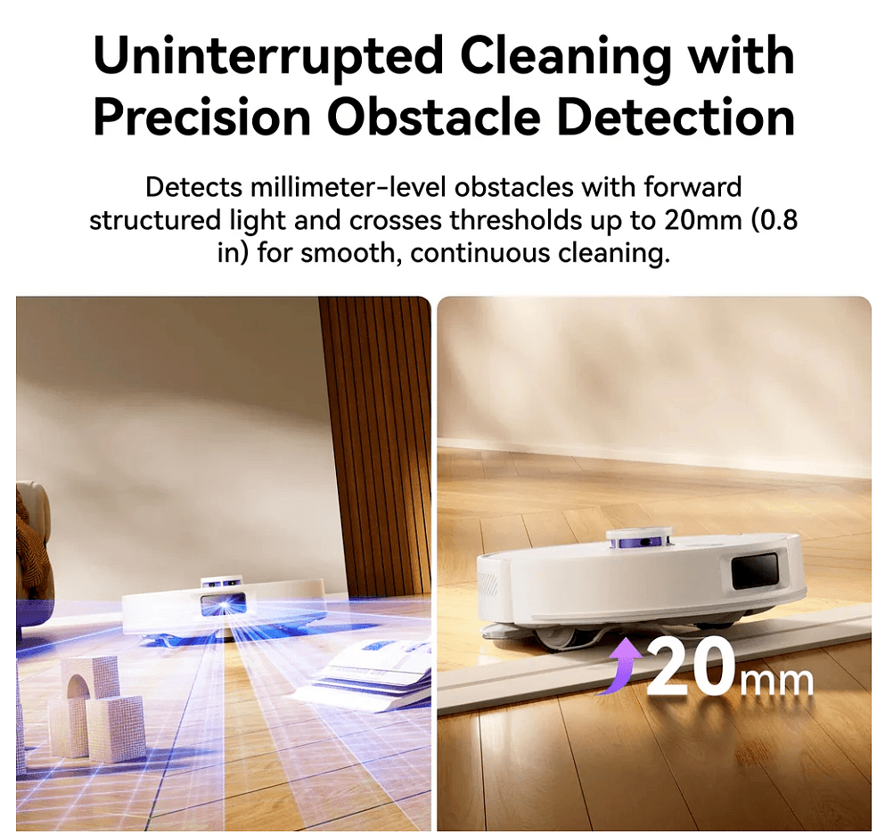 LDS-laserkartoitus ja rakenteellinen valolla toimiva esteentunnistus luovat tarkan kuvan kodista reaaliajassa. Robotti tunnistaa matalat esteet, liikkuu pehmeästi ja suunnittelee siivousreitin niin, ettei yksikään alue jää huomioimatta. Vahva kiipeilykyky auttaa ylittämään kynnyksiä ja mattoja, mikä takaa sujuvan siivouksen kaikilla pinnoilla.