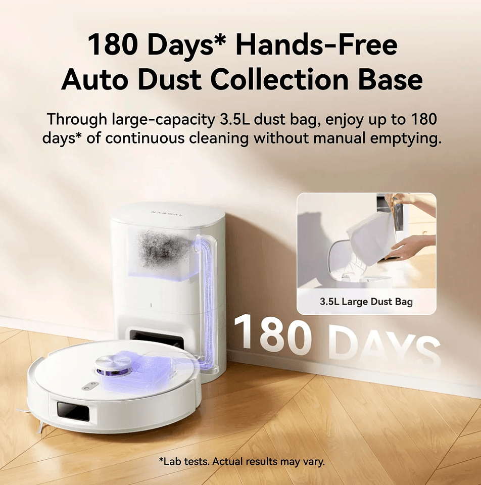 Automaattinen pölypussiasema ja 3,5 litran pölypussi tarjoavat jopa 180 päivää huoltovapaata käyttöä. Sinun ei tarvitse käsin tyhjentää pölysäiliötä, mikä tekee laitteesta erinomaisen valinnan kiireisiin koteihin. Desinfiointitoiminto pitää pölypussin hygienisenä ja käyttöympäristön siistinä.