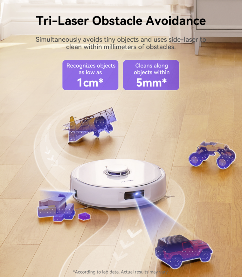 Kolmen laserin esteentunnistusjärjestelmä yhdistettynä edistyneeseen 3D-kartoitukseen mahdollistaa tarkan liikkumisen kodin jokaisessa nurkassa. Sivuanturit auttavat laitetta puhdistamaan esteiden ympäriltä ja aivan reunaan asti.