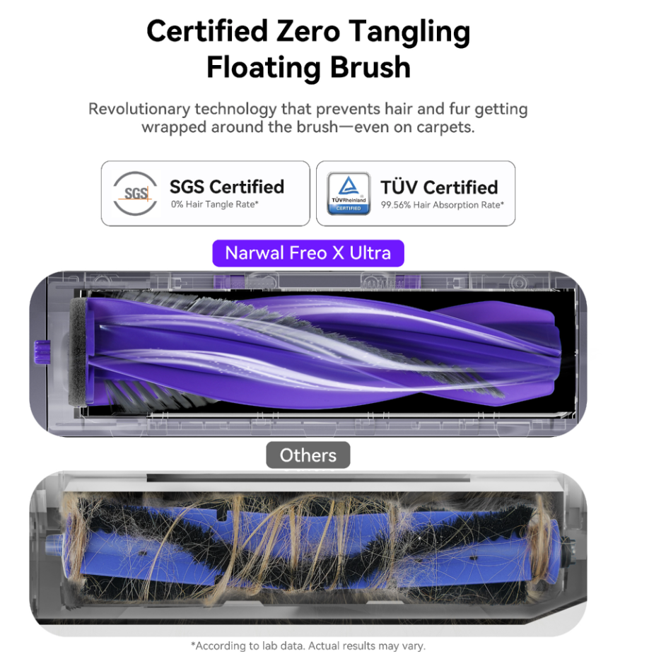 Innovatiivinen kartiomainen harja kelluvalla varrella estää hiusten ja lemmikkien karvojen sotkeutumisen. SGS- ja TÜV-sertifioitu rakenne takaa 0 % sotkeutumisen ja poistaa jopa 99,5 % karvoista suoraan pölypussiin - ilman ylimääräistä vaivaa.