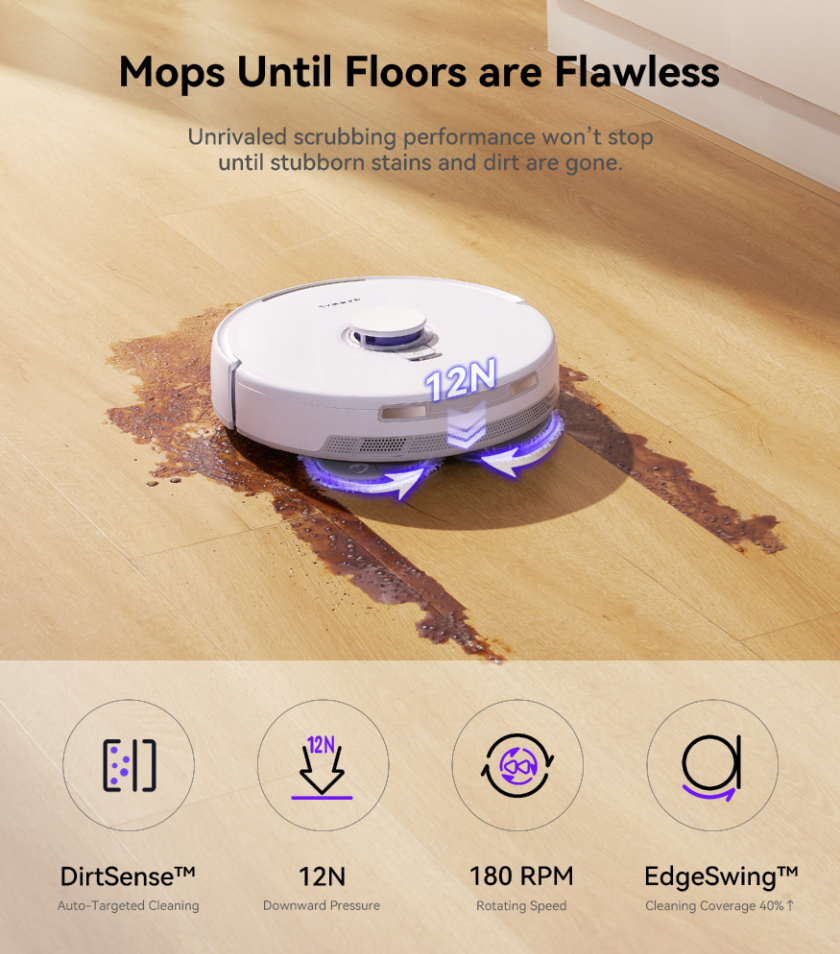Patentoidut Rouleaux-moppipäät pyörivät 180 kierrosta minuutissa ja painavat lattiaa vasten 12 N:n voimalla, jynssäten pois pinttyneetkin tahrat. AI DirtSense -tekoäly analysoi lattian puhtauden ja jatkaa moppausta, kunnes lopputulos on täydellinen. EdgeSwing-ominaisuus varmistaa, että myös nurkat ja reunat puhdistuvat huolellisesti.