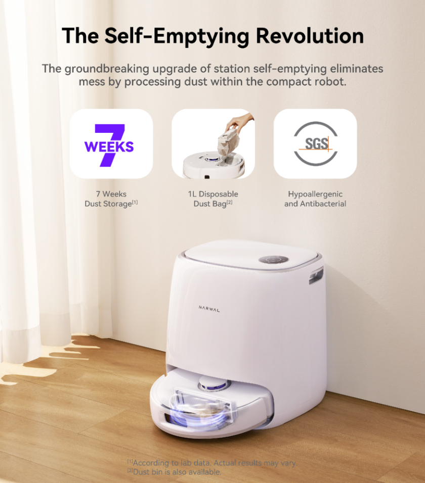 Toisin kuin perinteiset robotti-imurit, Freo X Ultra ei tyhjennä pölyä meluisasti tukiasemaan. Sen sisäänrakennettu pölynhallintajärjestelmä tiivistää pölyn kertakäyttöiseen pussiin, joka riittää jopa seitsemän viikon käyttöön - siististi ja hajuttomasti.