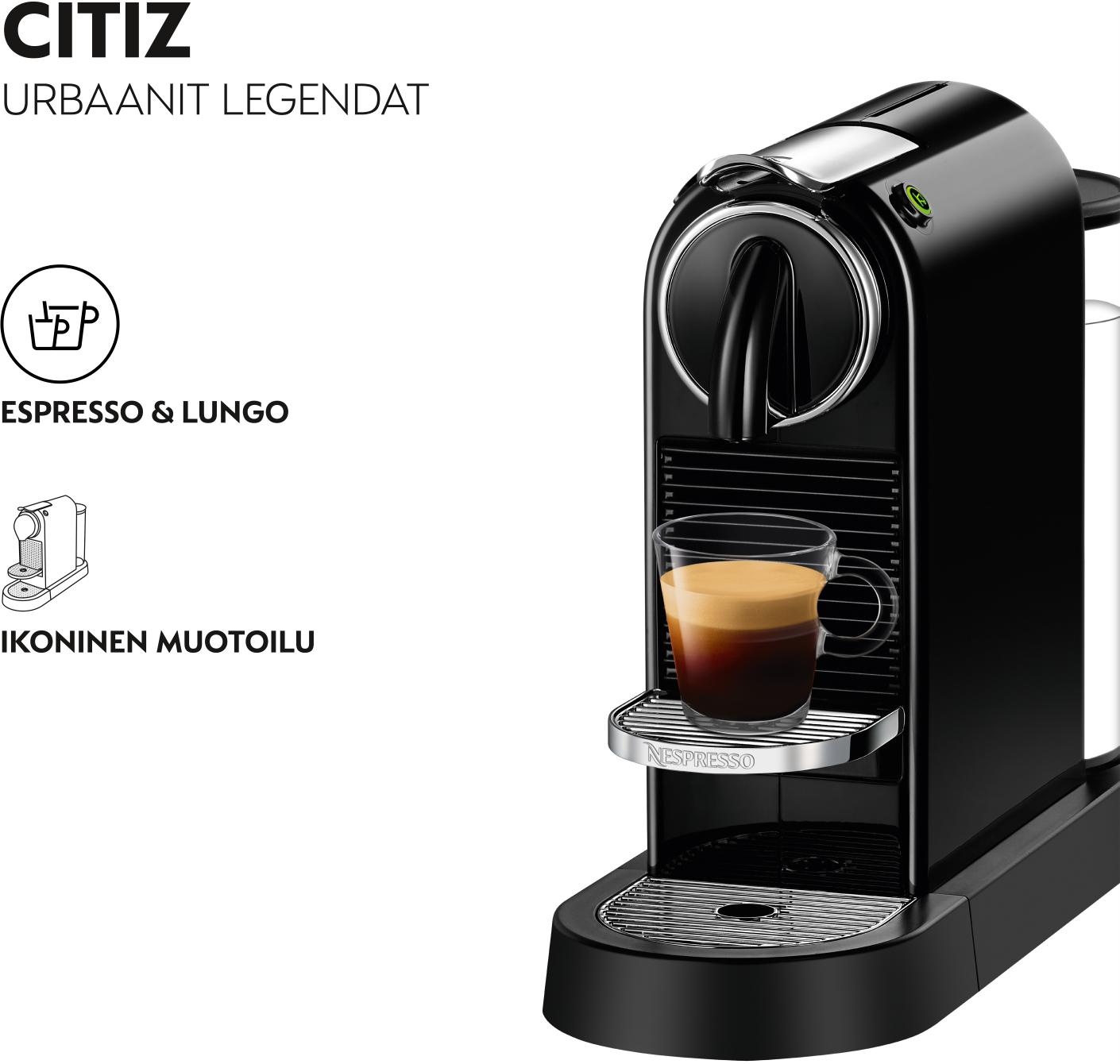Nespresso CitiZ on suunniteltu kaupunkilaiseen elämäntyyliin, ja se kuumenee käyttövalmiiksi nopeasti. Valitsemasi Nespresso-kahvi valmistuu vain yhden napin painalluksella. Tämä kahvikone jatkaa Nespresso-kahvinjuojien ja muotoilun ystävien toiveiden täyttämistä, lisäten ripauksen tyylikkyyttä kahvihetkiin ympäri maailman. Kompakti muotoilu sopii kaikkiin keittiöihin, ja Espresso ja Lungo kahvit valmistuvat helposti nappia painamalla.