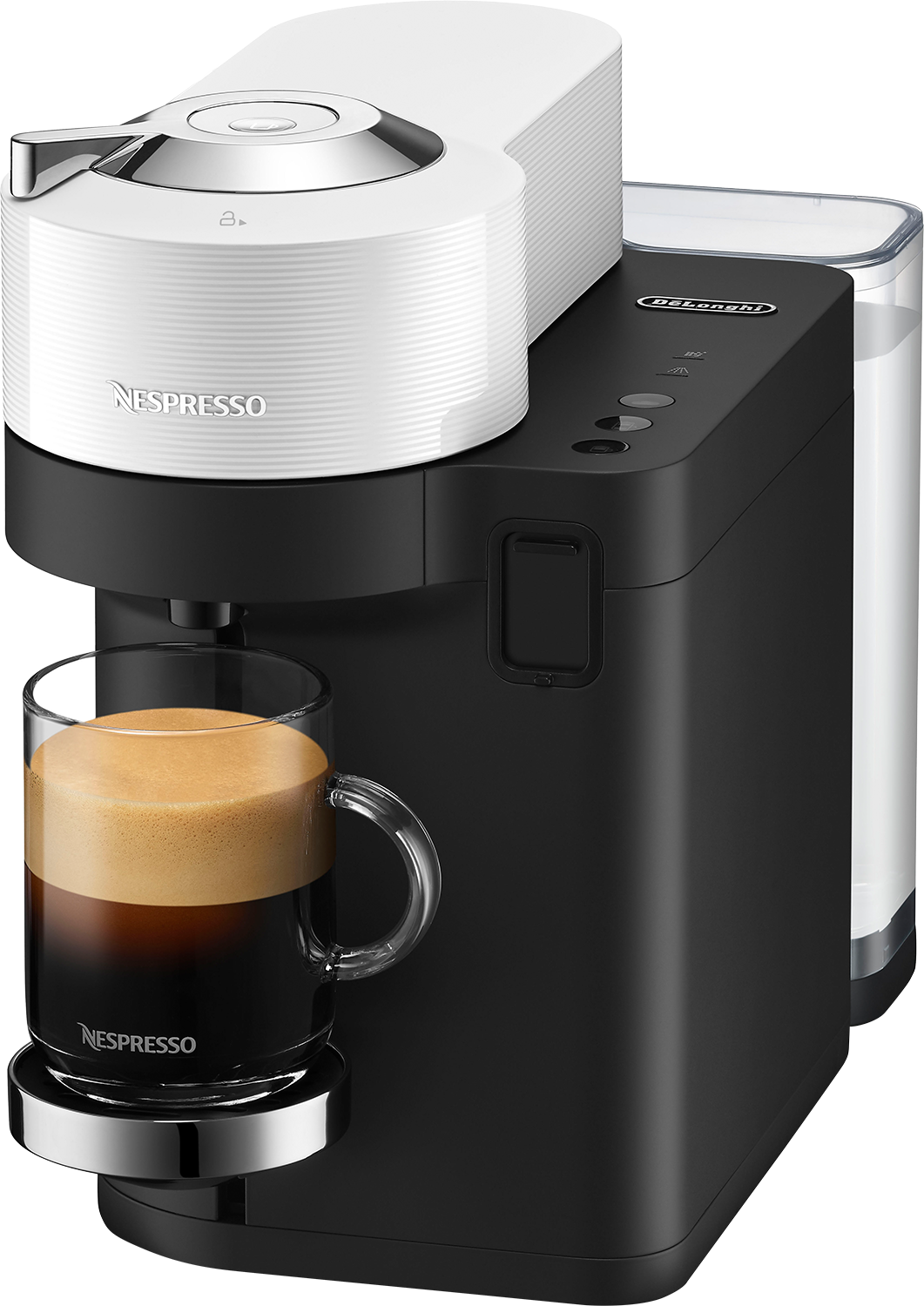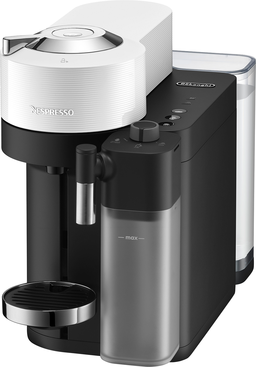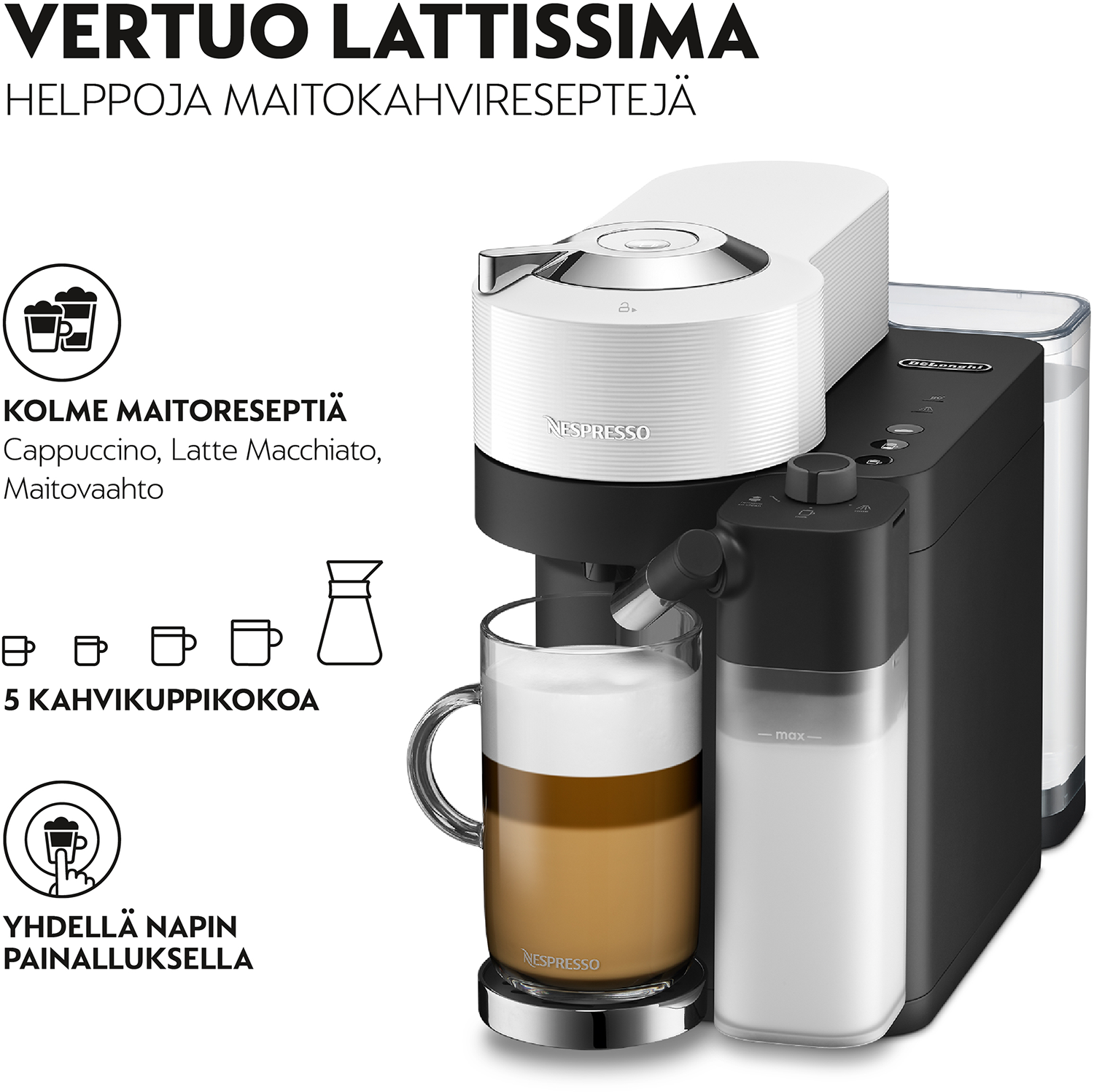 Nespresso Vertuo Lattissima kahvikone on saatavilla mustana ja valkoisena, kauniilla kromatuilla yksityiskohdilla viimeisteltynä. Tyylikäs muotoilu takaa, että kahvikone sopii kaikkiin keittiöihin.