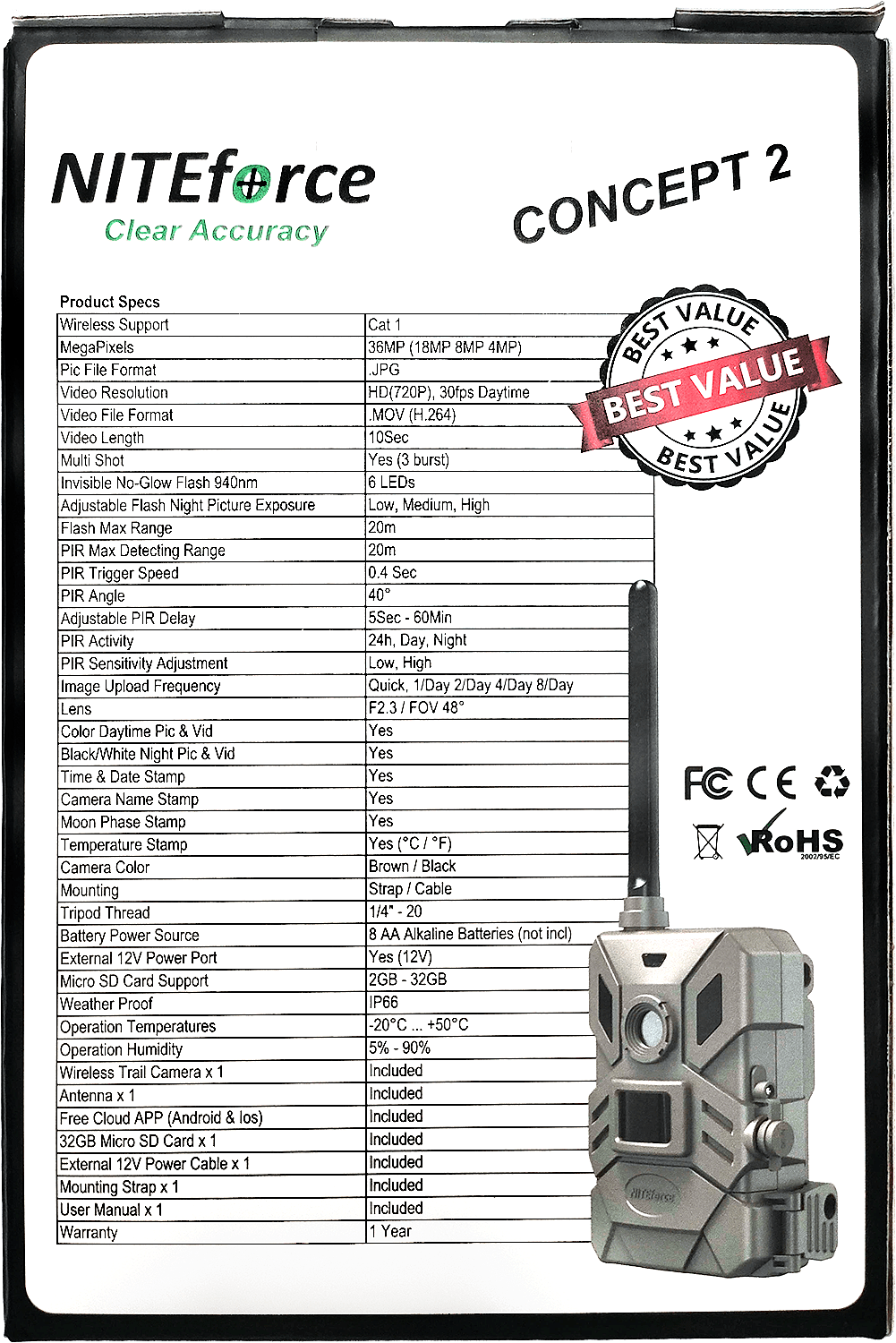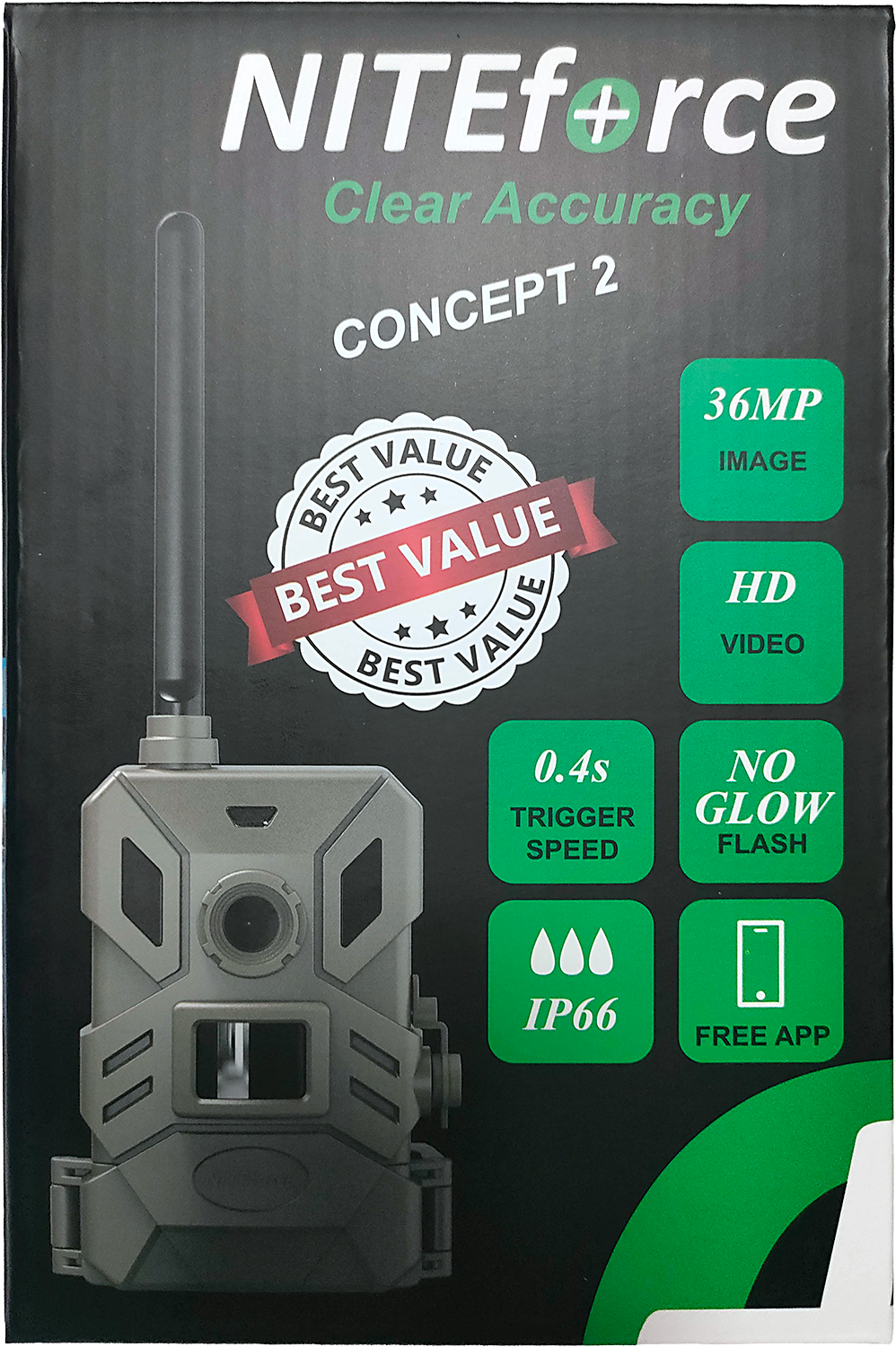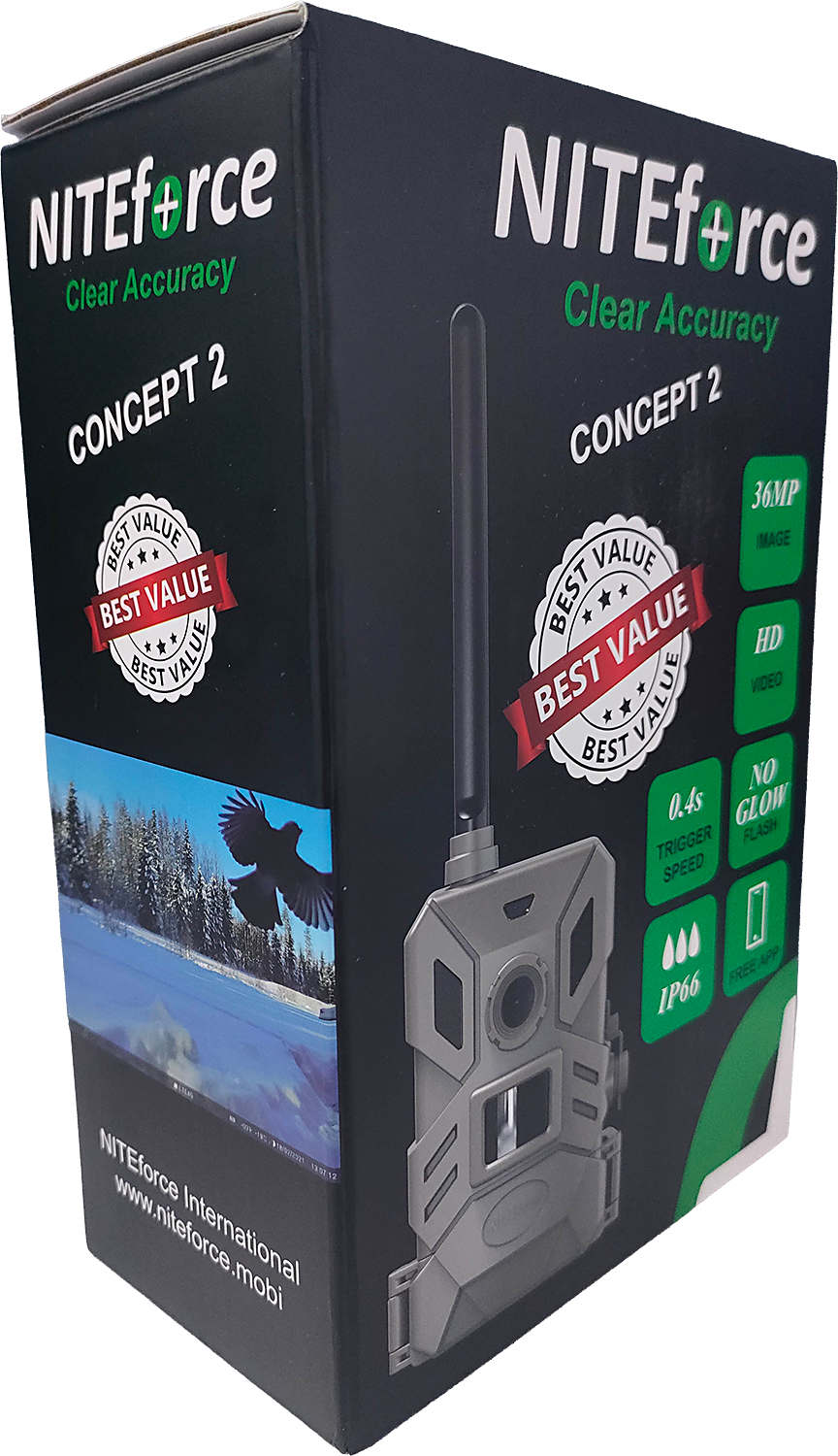 NITEforce Concept 2 on huippuluokan etäohjattava riistakamera, joka tarjoaa jopa 36 megapikselin tarkkuudella tallennettuja kuvia sekä 10 sekunnin HD-videon lähetyksen. Kamera toimii saumattomasti suomenkielisen mobiilisovelluksen kanssa, jonka avulla voit hallita laitetta missä tahansa liikutkin. Kaikki tallenteet siirtyvät automaattisesti mukana tulevalle 32GB Micro SD -muistikortille, ja sovelluksen kautta voit halutessasi ohjata kuvat ja videot myös sähköpostiisi.