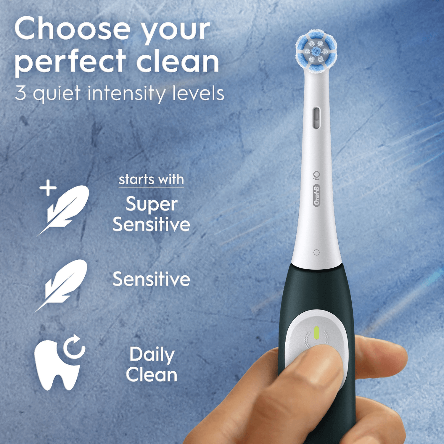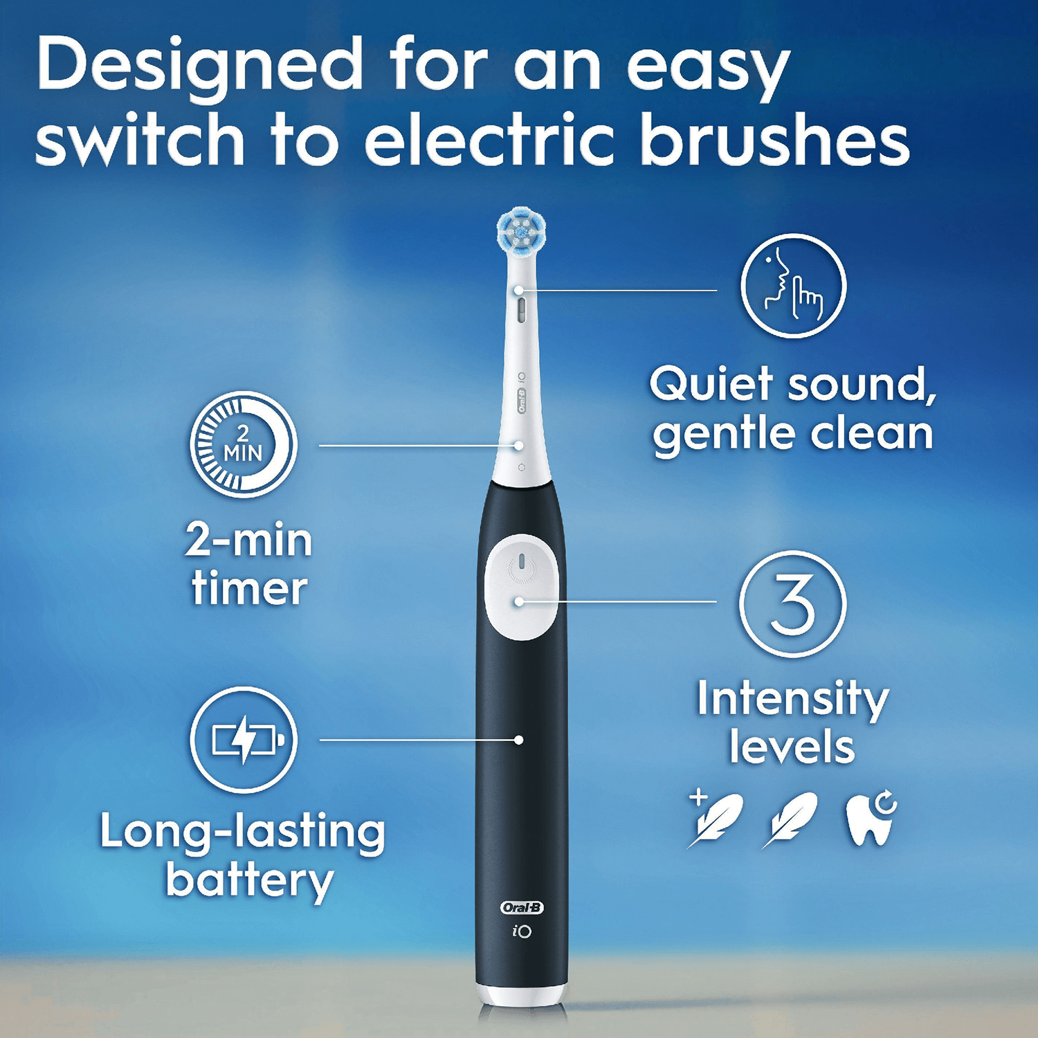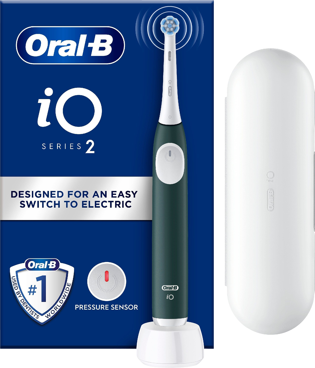 Oral-B iO2 Sähköhammasharja + matkakotelo tarjoaa syväpuhdistuksen pyöreällä harjaspäällä, 3 voimakkuusasteella, ienpaineanturilla ja 2 minuutin ajastimella, joka tarjoaa 30 sekunnin hälytykset.