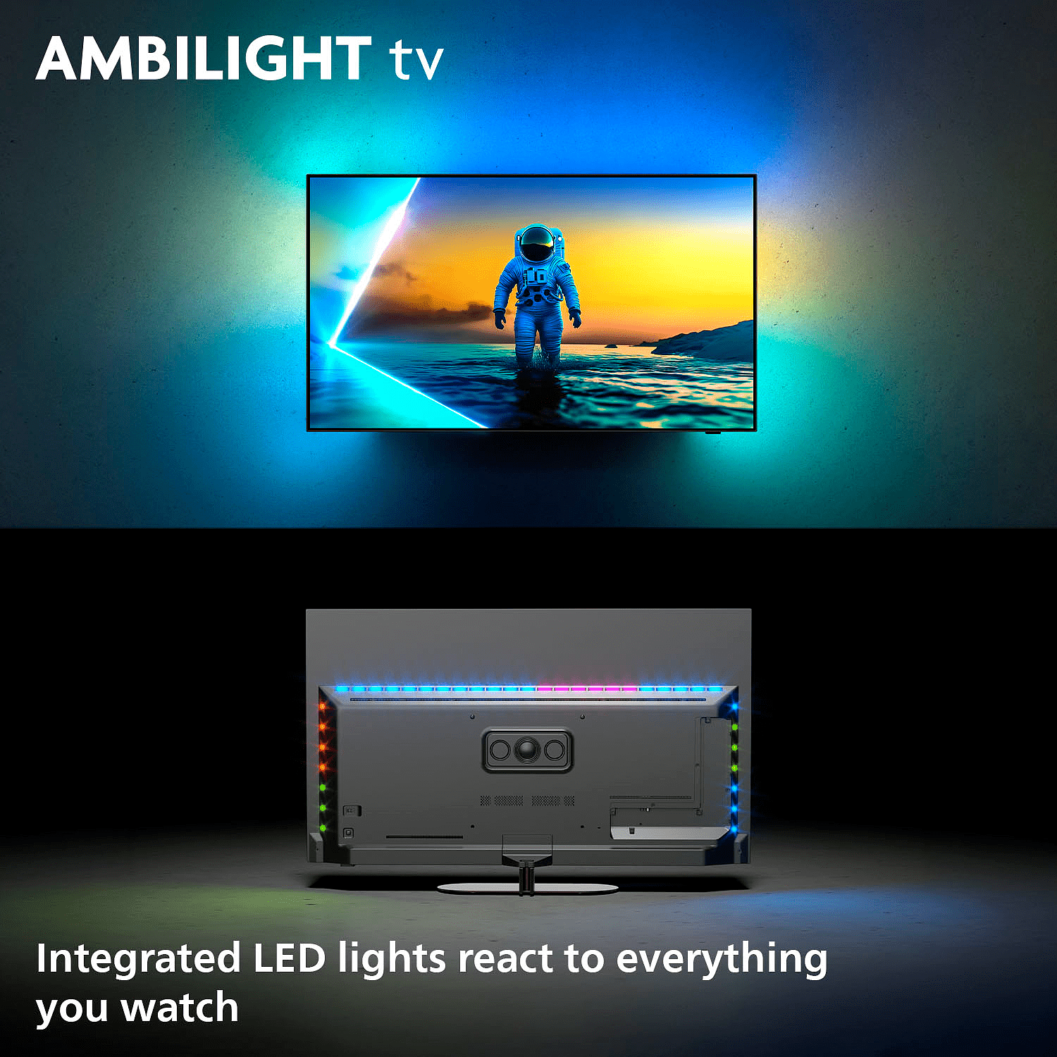 Ambilight-televisiot ovat ainoita televisioita, joissa taustapuolelle integroidut LED-valot reagoivat katsomaasi ja upottavat sinut televisiota ympäröivän värikkään valon hehkuun. Se muuttaa kaiken - televisiosi näyttää suuremmalta, ja pääset syvemmälle sisään urheilulähetyksiin, elokuviin, musiikkiin ja peleihin.