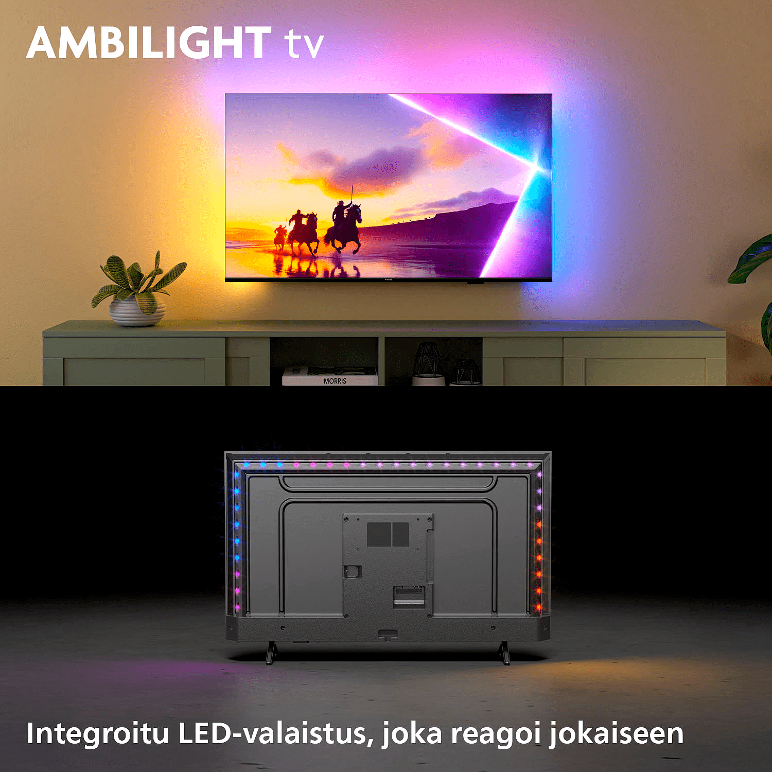 Ambilightin integroidut LED-valot reagoivat katsomaasi ja ympäröivät television värikkäällä hehkulla. Elokuvat, urheilu, musiikkivideot ja pelit näyttävät jatkuvan kuvaruudun ulkopuolelle upottaen sinut entistä syvemmälle katselukokemukseen. Kun olet kerran kokeillut sitä, et enää halua olla ilman.