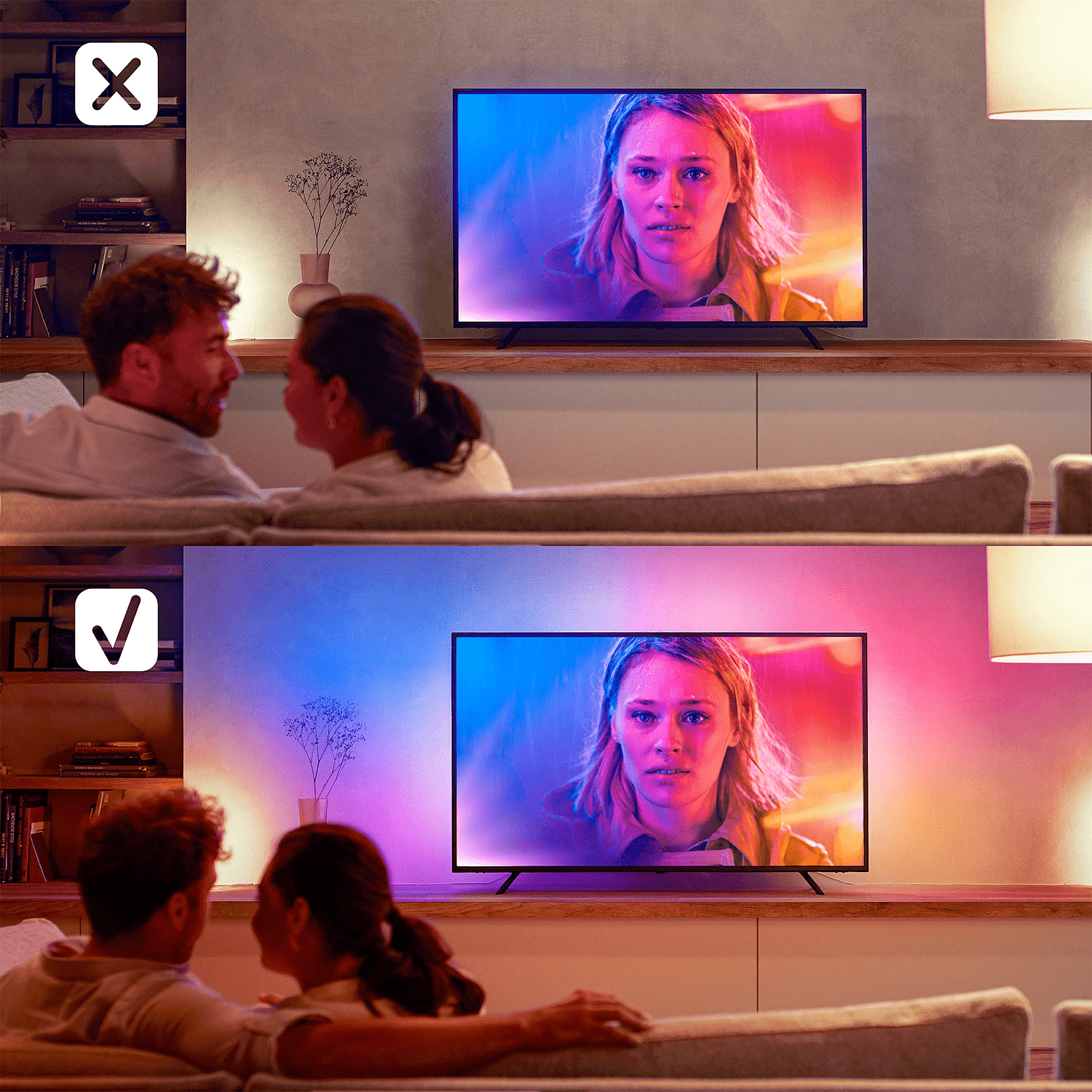 Jotta valonauha reagoi näytön tapahtumiin, se on synkronoitava Hue Sync -sovelluksella tai Philips Hue Play HDMI sync boxilla. Tämä yhdistelmä luo vangitsevan katselu- ja pelikokemuksen, jossa valot sulautuvat saumattomasti sisällön väreihin. Valotehoste heijastuu seinälle 45 asteen kulmassa ja tuo elokuvien ja pelien tunnelman koko huoneeseen.