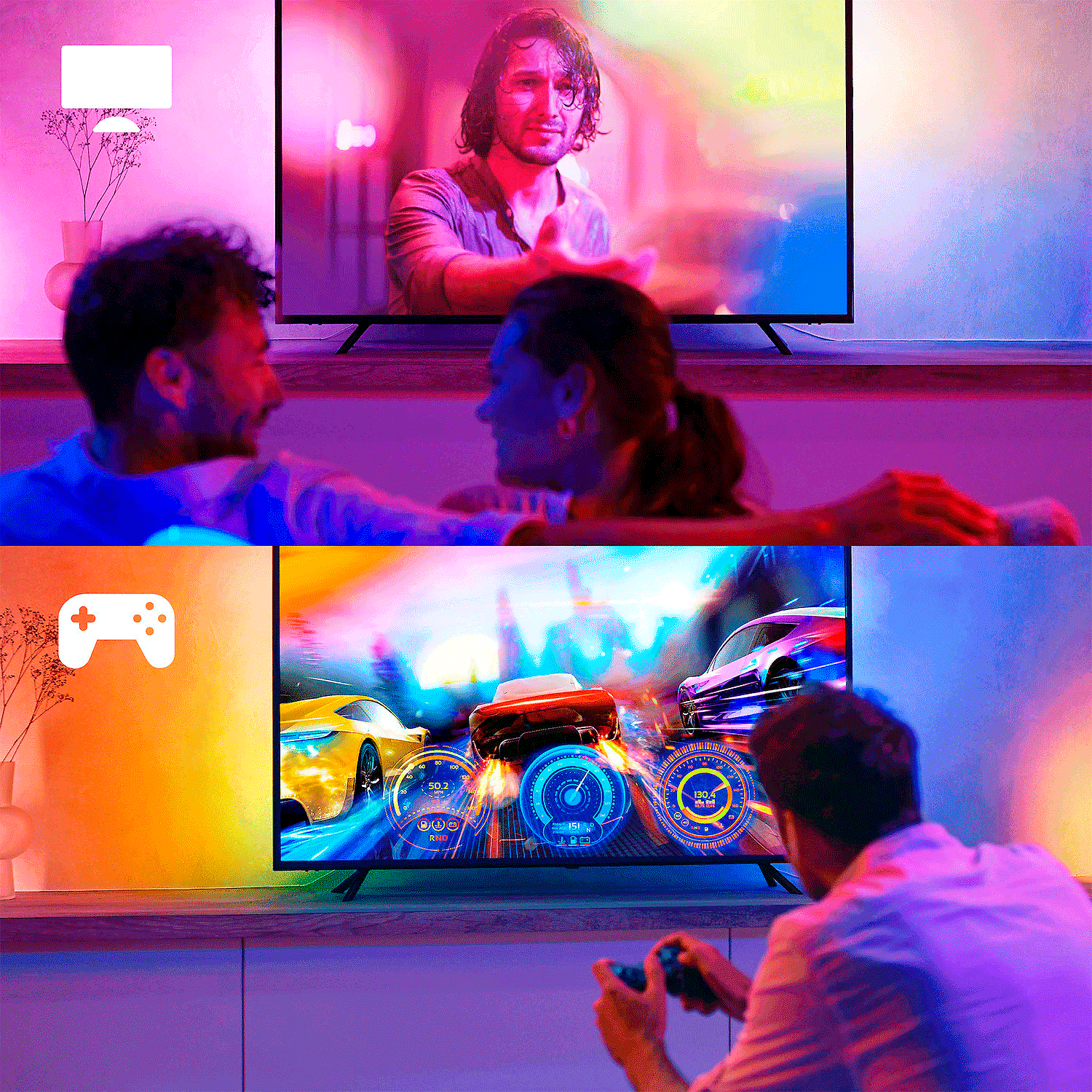 Jotta valonauha reagoi näytön tapahtumiin, se on synkronoitava Hue Sync -sovelluksella tai Philips Hue Play HDMI sync boxilla. Tämä yhdistelmä luo vangitsevan katselu- ja pelikokemuksen, jossa valot sulautuvat saumattomasti sisällön väreihin. Valotehoste heijastuu seinälle 45 asteen kulmassa ja tuo elokuvien ja pelien tunnelman koko huoneeseen.