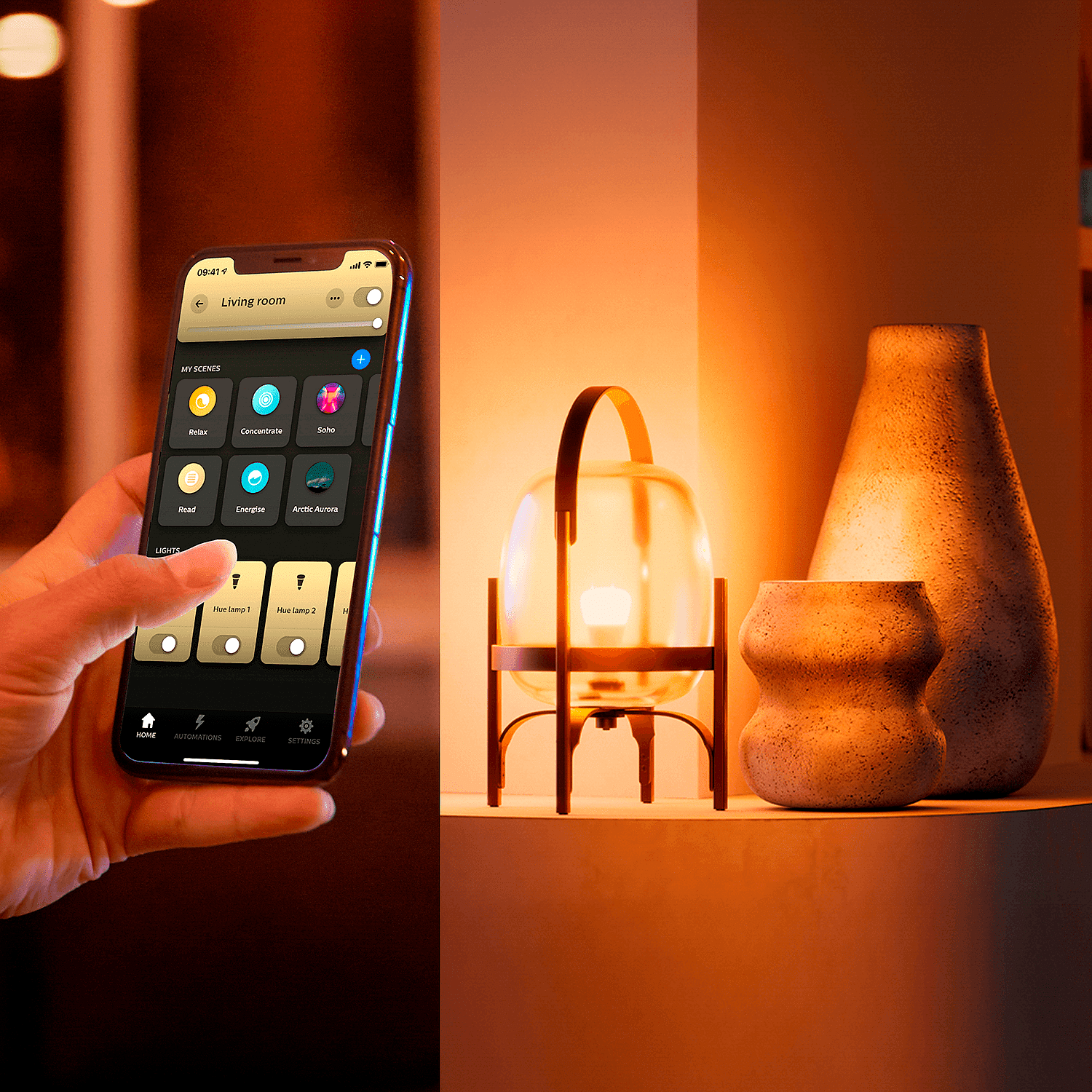 Hue White ambiance -sarjan lamput tarjoavat neljä valmista valaistusasetusta, jotka tukevat arjen eri vaiheita. Voit valita asetuksen keskittymiseen, piristymiseen, lukemiseen tai rentoutumiseen. Lisäksi saatavilla on dynaamisia valotehosteita, kuten Kynttilänvalo, joka luo pehmeän ja kultaisen hehkun esimerkiksi iltahetkiin.