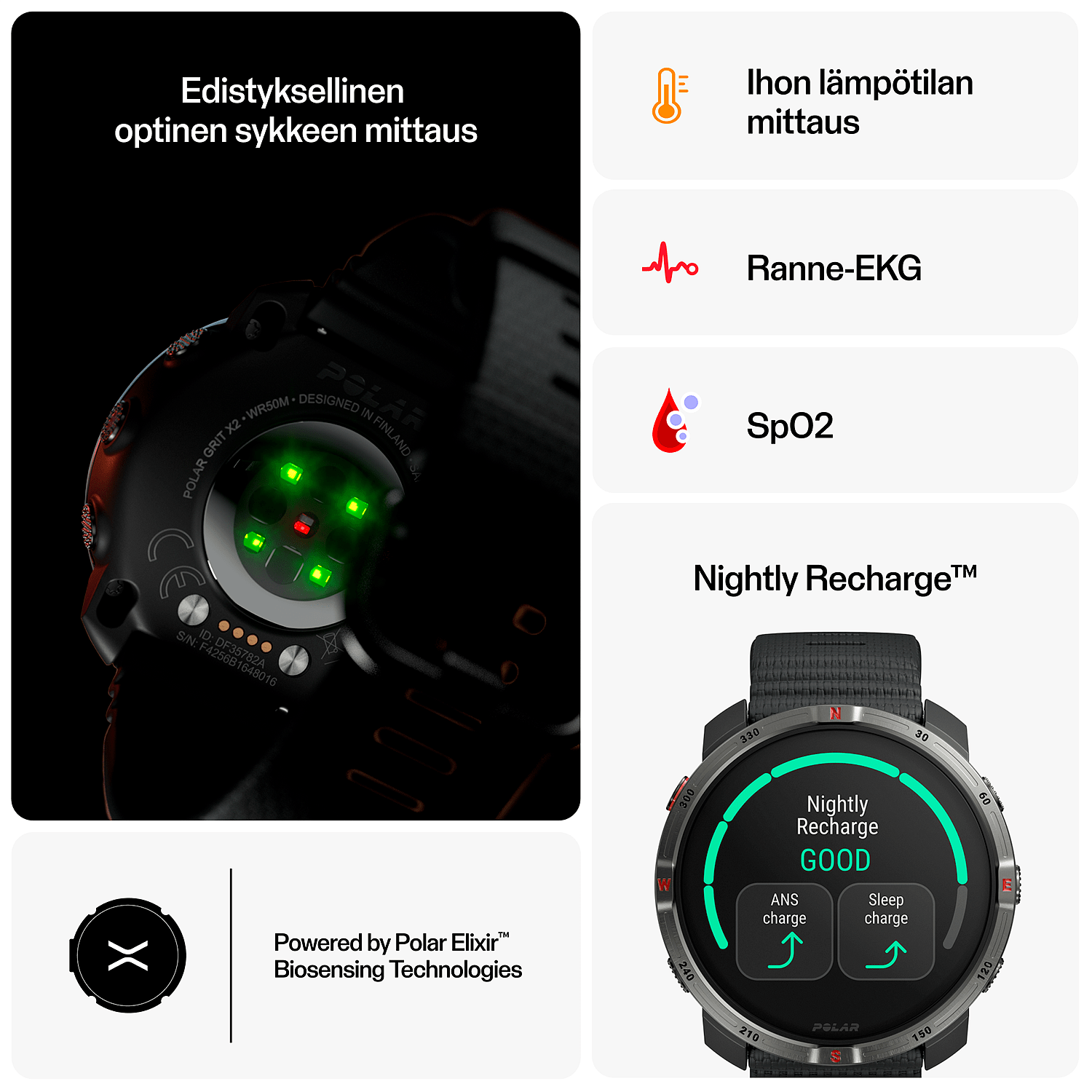 Polar Elixir tuo käyttöösi markkinoiden tarkimmat biomittaukset: optinen sykemittaus, ranne-EKG, SpO2, yönaikainen ihon lämpötila ja sykevälivaihtelut. Nämä mittarit tarjoavat reaaliaikaista tietoa sydänterveydestä, palautumisesta ja hyvinvoinnista - ilman erillisiä lisälaitteita.
