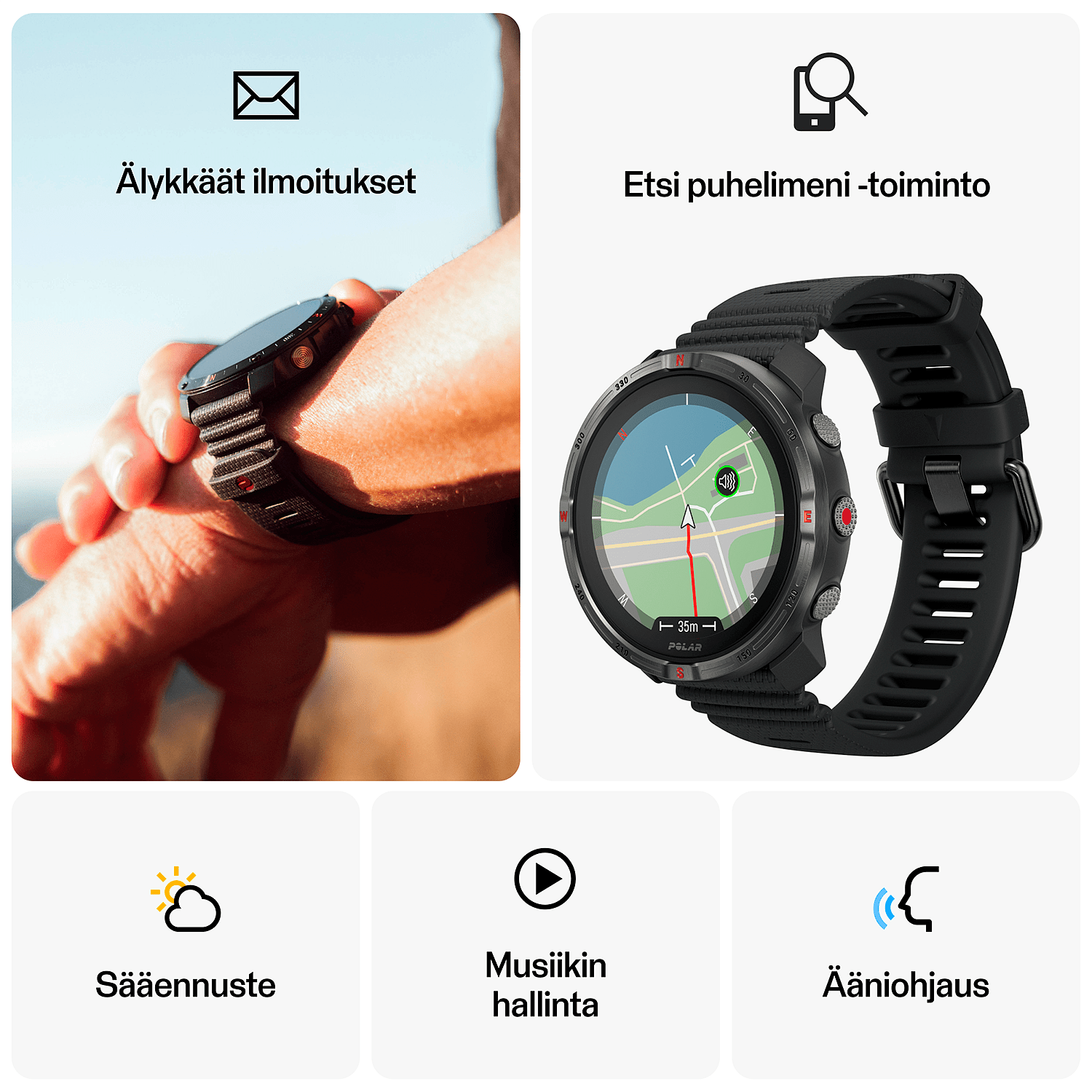 Grit X2 ei ole vain urheilukello - se on myös täysiverinen älykello. Saat ilmoitukset puheluista, viesteistä ja sovelluksista suoraan ranteeseesi. Voit hallita musiikkia, tarkistaa sääennusteen, käyttää "etsi puhelimeni" -toimintoa ja hyödyntää ääniohjausta harjoituksissa. Mukautettavat kellonäkymät ja widgetit tekevät käytöstä sujuvaa ja henkilökohtaista.