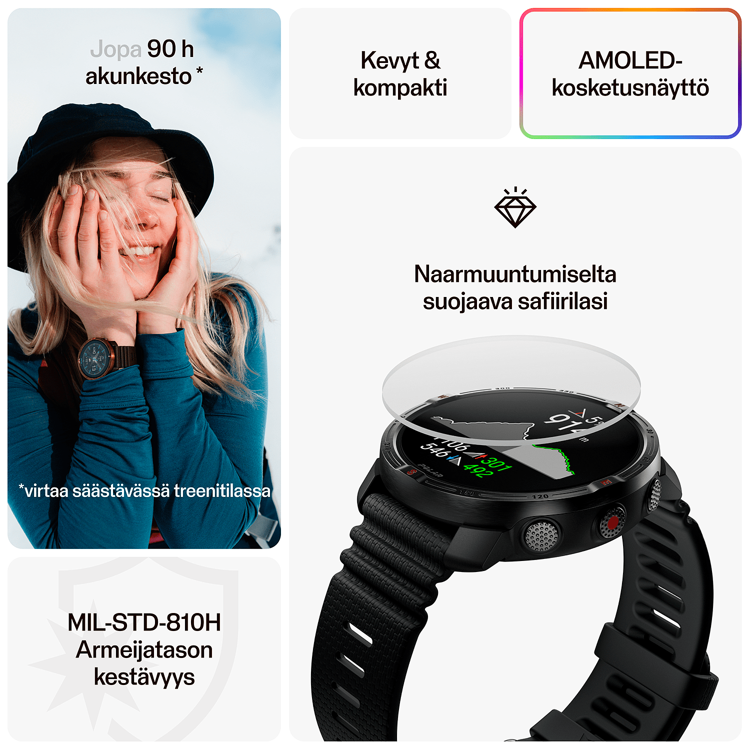 Kaksitaajuuksinen GPS (L1 + L5) tukee useita satelliittijärjestelmiä ja tarjoaa tarkan paikannuksen myös haastavissa olosuhteissa. Offline-kartat, kiinnostavat kohteet (POI), kuljettu reitti -toiminto ja Strava-yhteensopivuus mahdollistavat turvallisen ja suunnitelmallisen liikkumisen. Hill Splitter, 3D-nopeus, nousu-/laskunopeus ja reaaliaikaiset korkeusprofiilit tarjoavat syvällistä tietoa maaston vaikutuksesta suoritukseesi.
