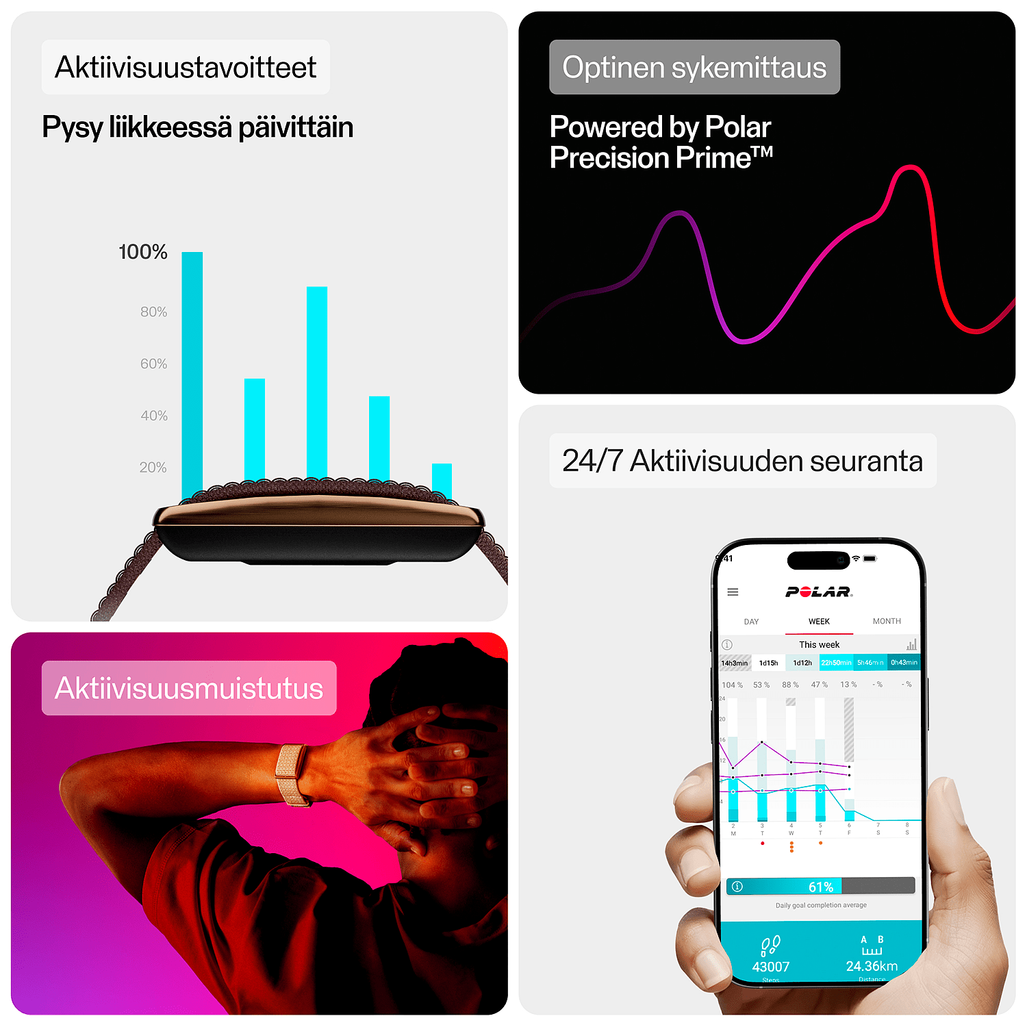 Polar Loop on näytötön ja kuukausimaksuton aktiivisuusranneke, joka on suunniteltu ympärivuorokautiseen hyvinvoinnin seurantaan - ei häiriötekijöitä tai piilokuluja, vain tieteeseen perustuvia ominaisuuksia. Se seuraa unta, sykettä, aktiivisuutta ja treenejä auttaakseen sinua ymmärtämään energiatasojesi, palautumisesi ja harjoittelusi kokonaiskuvan. Polar Loop auttaa sinua rakentamaan parempia tapoja, pysymään aktiivisena, nukkumaan paremmin ja saamaan kaiken irti jokaisesta päivästä ja yöstä.
