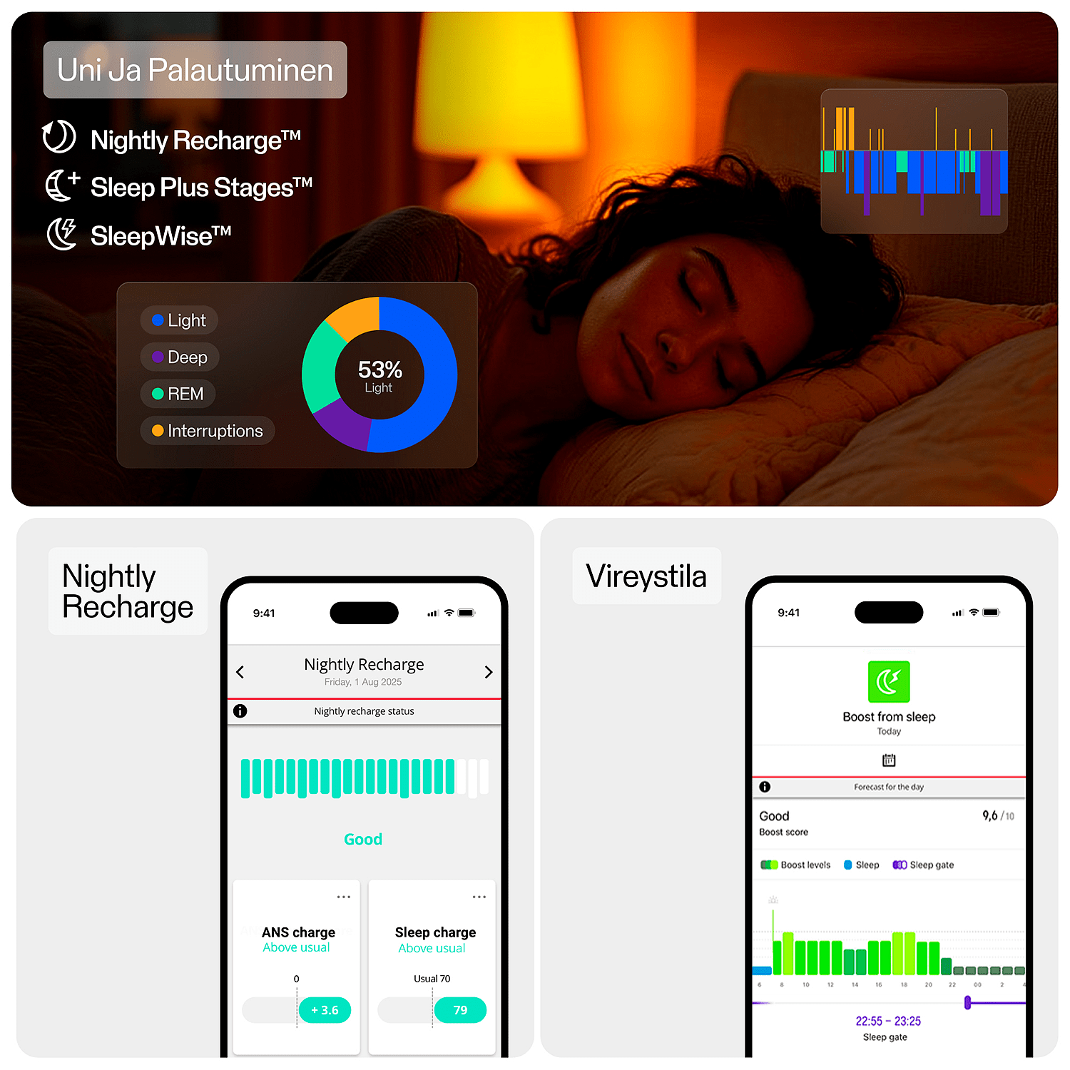 Unen ja palautumisen seuranta Näet kuinka hyvin oikeasti palaudut, jotta voit parantaa iltarutiinejasi, nukkua paremmin ja herätä valmiina uuteen päivään.