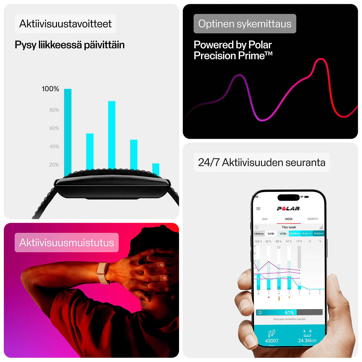 Aktiivisuus Päivittäinen aktiivisuustavoite tekee aktiivisena pysymisestä yksinkertaista ja motivoivaa. Tavoitteesi? Saavuta 100 % joka päivä. Näet, kuinka paljon oikeasti liikut päivittäin ja miten pienet onnistumiset kertyvät paremmaksi energiaksi ja vauhdiksi.