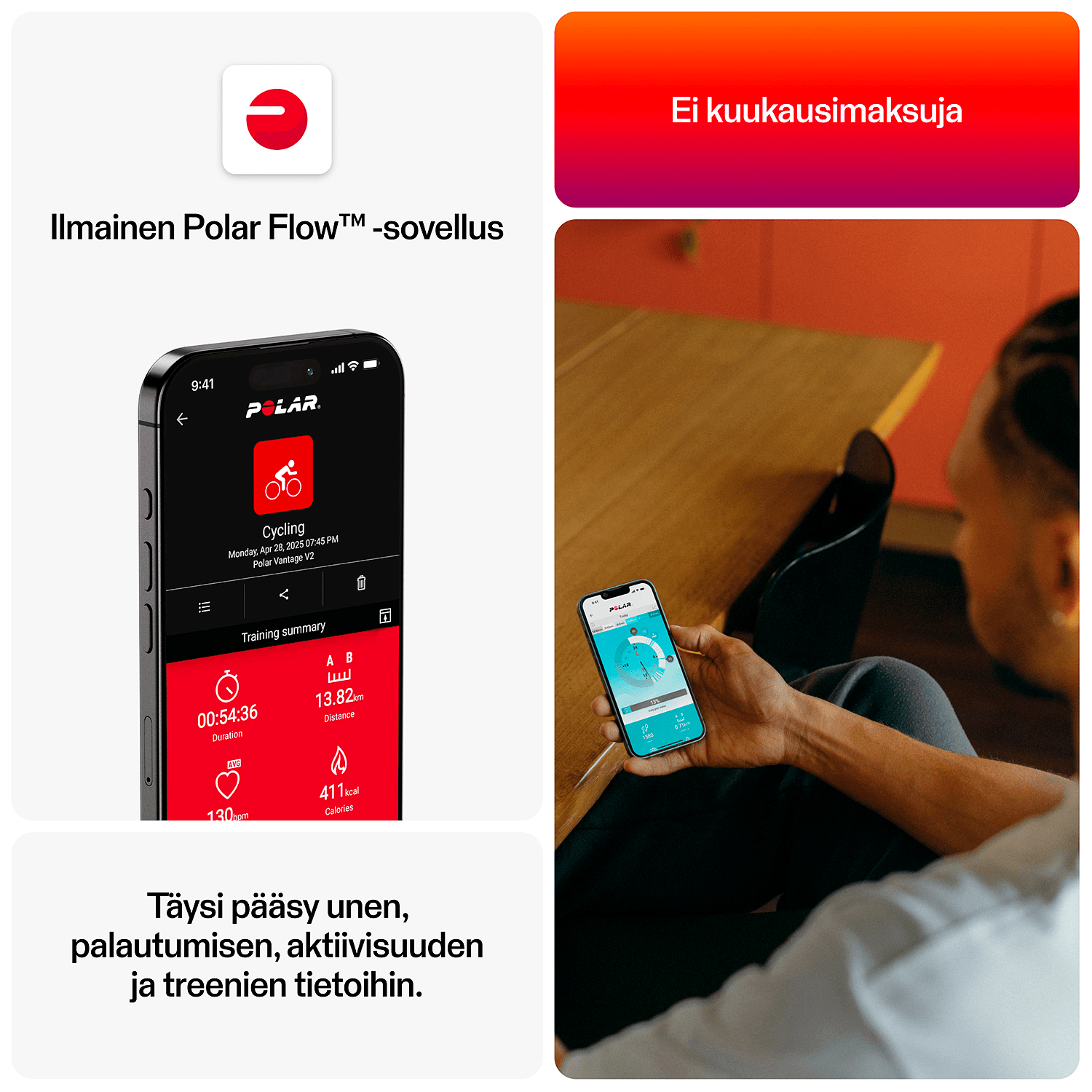 Harjoittelu Kyse ei ole siitä, että treenaisit kovempaa, vaan fiksummin. Polar Smart Coaching on älykkäämpi tapa edistyä ja saavuttaa tavoitteesi. Se tarjoaa oivalluksia ja motivaatiota, joiden avulla voit ylittää rajasi, seurata kehitystäsi ja palautua paremmin. Kaikki Polarin harjoitteluteknologia perustuu tieteelliseen tutkimukseen ja validointiin.