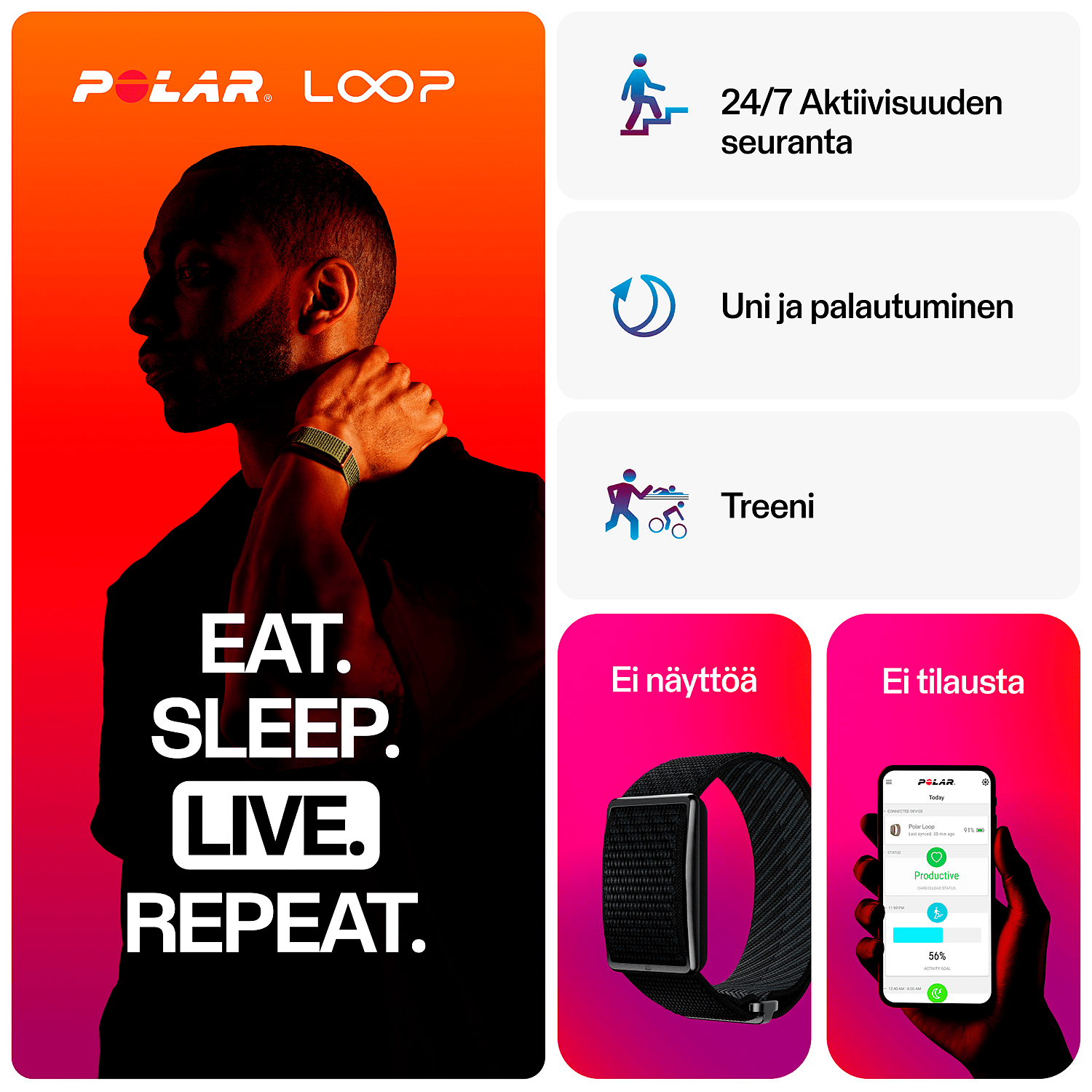 Polar Loop on näytötön ja kuukausimaksuton aktiivisuusranneke, joka on suunniteltu ympärivuorokautiseen hyvinvoinnin seurantaan - ei häiriötekijöitä tai piilokuluja, vain tieteeseen perustuvia ominaisuuksia. Se seuraa unta, sykettä, aktiivisuutta ja treenejä auttaakseen sinua ymmärtämään energiatasojesi, palautumisesi ja harjoittelusi kokonaiskuvan. Polar Loop auttaa sinua rakentamaan parempia tapoja, pysymään aktiivisena, nukkumaan paremmin ja saamaan kaiken irti jokaisesta päivästä ja yöstä.