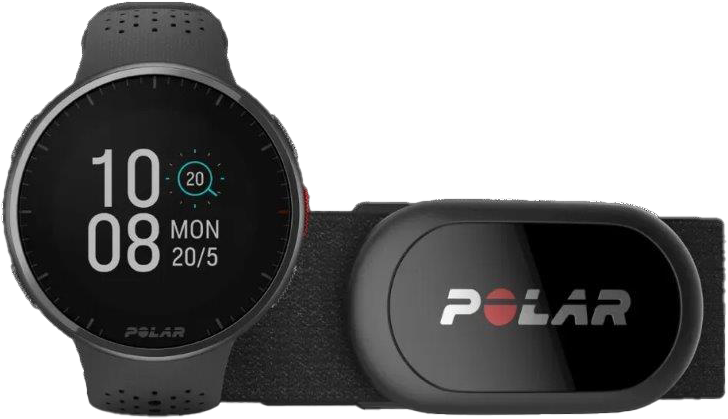 Polar Pacer Pro -GPS-juoksukello, Polar H10-sykevyö, USB-latausjohto, shift adapteri, käyttöopas, tietolehtinen.