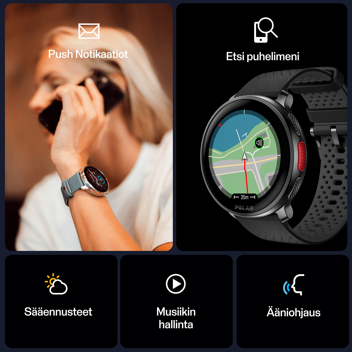 AMOLED-kosketusnäyttö 3.0 Gorilla-lasilla, 53 tuntia treeniaikaa täydellä GPS:llä ja sykkeenmittauksella (jopa 140 tuntia virransäästötiloilla) ja jopa 8 päivää kellotilassa.
