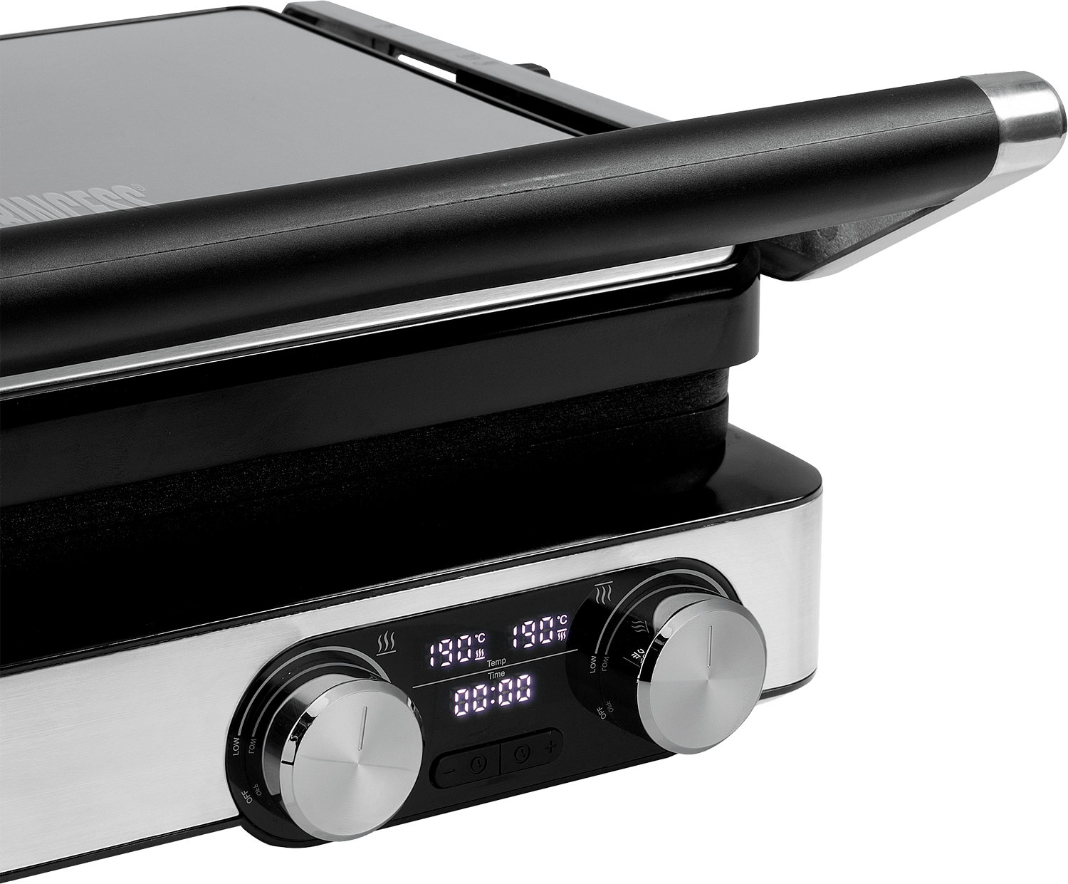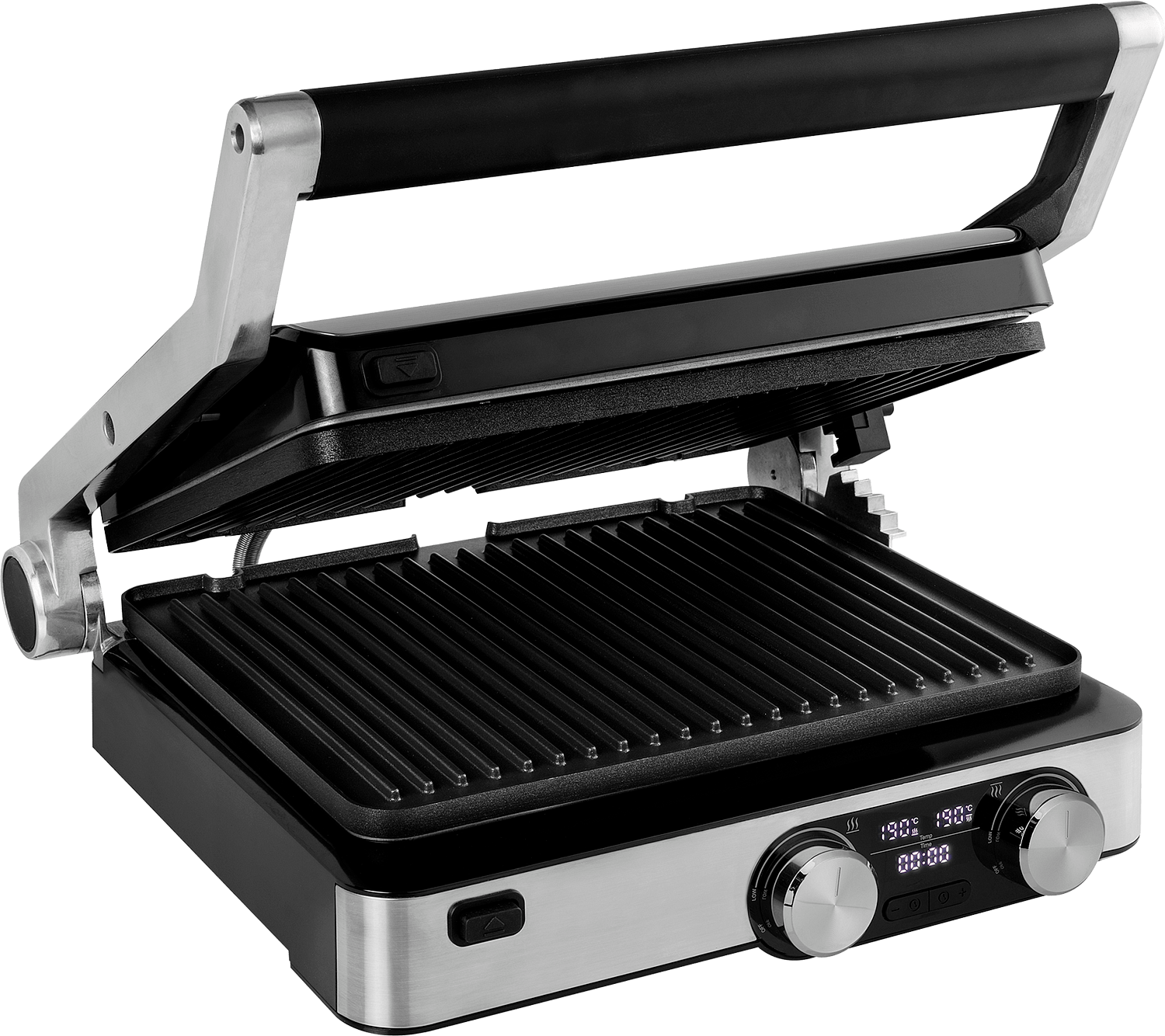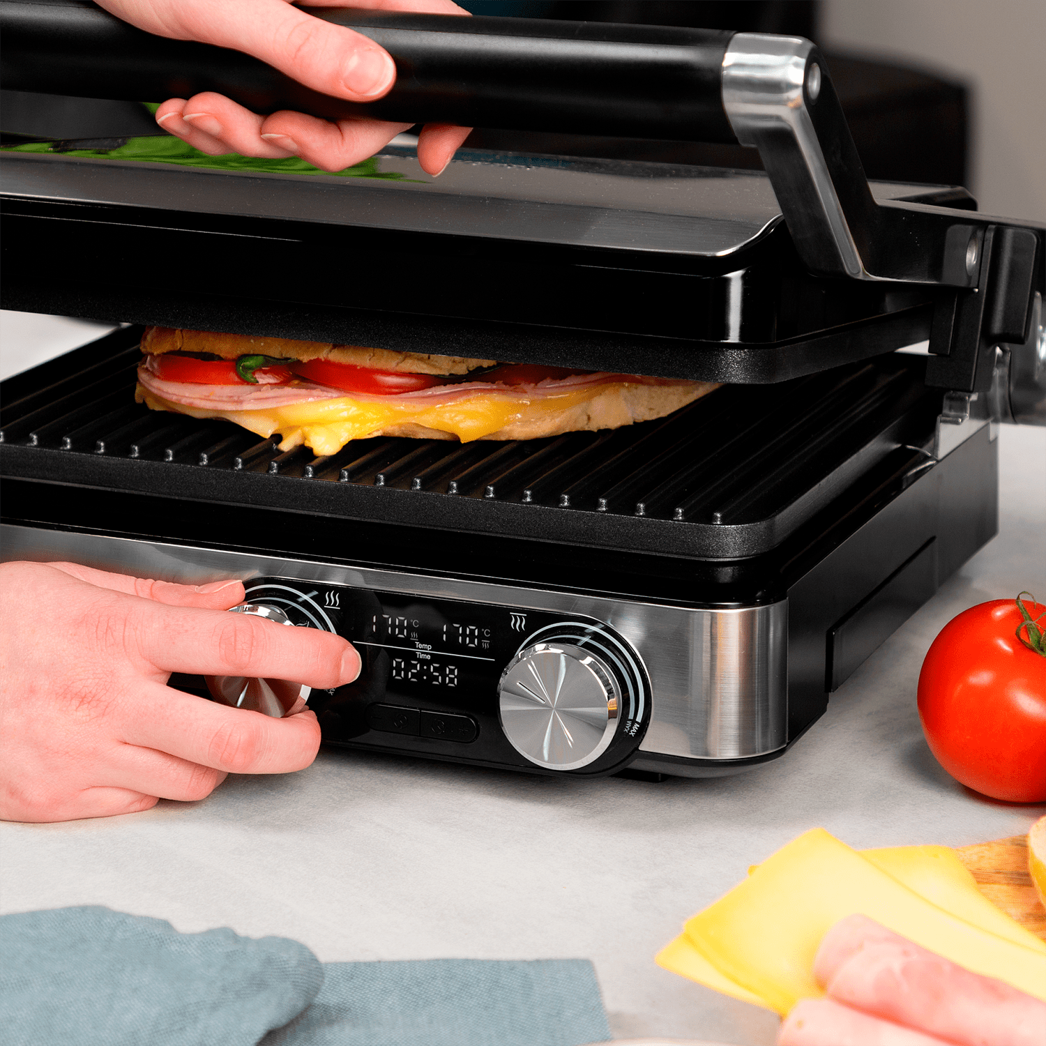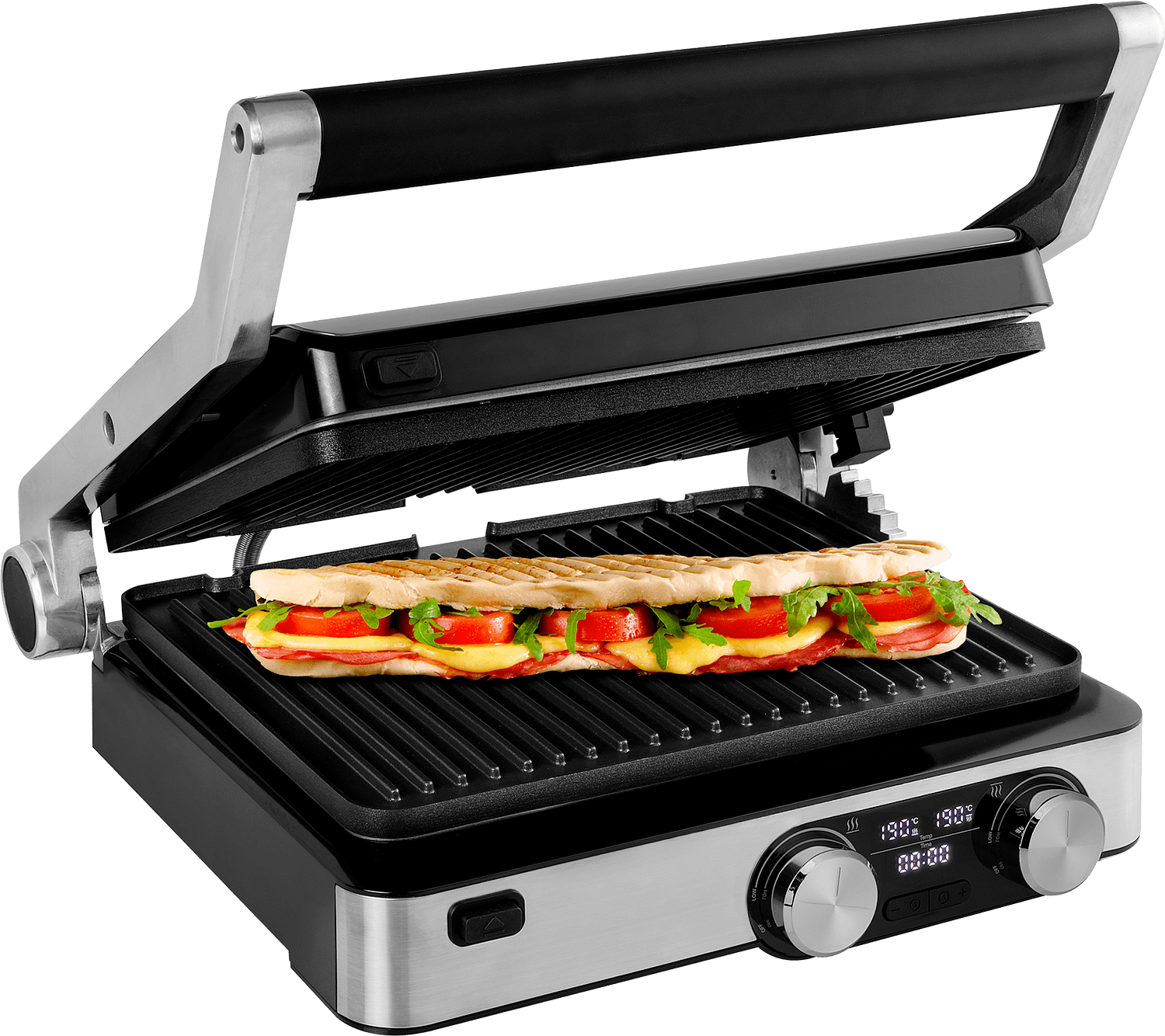 Ruostumattomasta teräksestä valmistettu Grill Master Pro on tyylikäs ja käytännöllinen. Digitaalinen ohjauspaneeli tekee käytöstä helppoa, ja ajastintoiminto varmistaa, että paninit ja sandwichit valmistuvat juuri oikeaan aikaan.