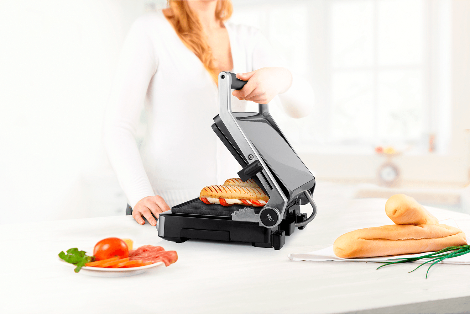 Kaksi erillistä termostaattia antavat täyden kontrollin: säädä ylä- ja alalevyn lämpötilaa erikseen ja valmista täydellisiä panineja, pihvejä tai kasviksia. Grillin voi avata 180° ja käyttää pöytägrillinä - yhdellä levyllä kypsyy mehukas pihvi, toisella rapeat kasvikset. Tehokas 2000 W moottori takaa nopean kuumenemisen.