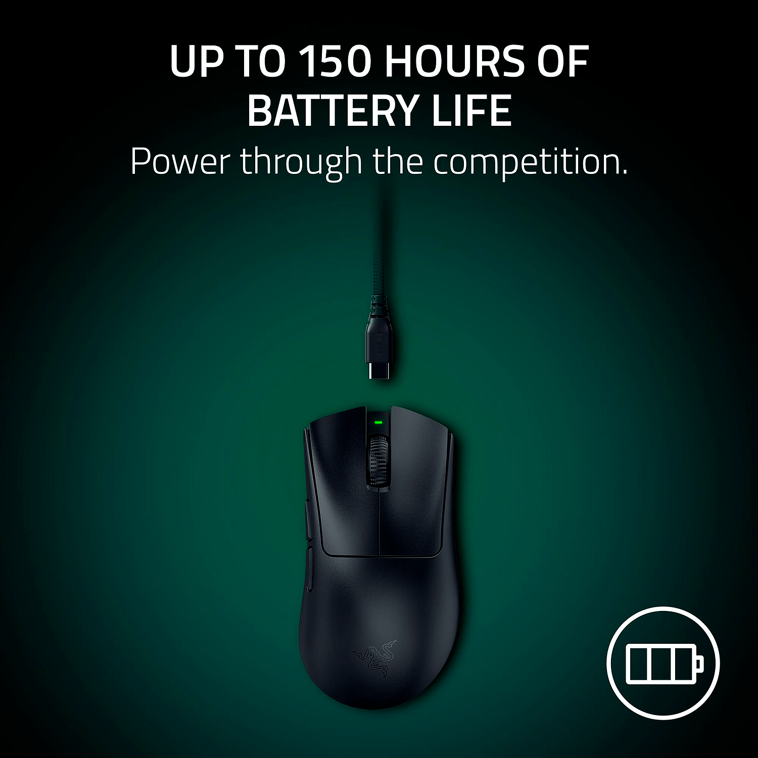 Akun kesto on vakuuttava: jopa 150 tuntia käytössä 1000 Hz taajuudella, ja noin 22 tuntia täysitehoisella 8000 Hz tilalla. Lataus onnistuu nopeasti USB-C-yhteydellä tai Razerin lataustelakan avulla (myydään erikseen).