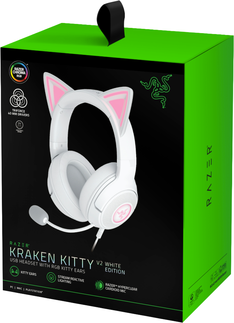 Razer Kraken Kitty V2 RGB - pelikuulokkeet, jotka tuovat kissatyylisi esiin Ilmaise omaa pelipersoonaasi rohkeasti Razer Kraken Kitty V2 RGB -kuulokkeilla, jotka on suunniteltu erityisesti pelaamiseen ja IRL-striimaukseen. Näissä kuulokkeissa yhdistyvät huipputason äänenlaatu, näyttävä ulkonäkö ja älykäs teknologia ? kaikki mitä tarvitset erottuaksesi joukosta.