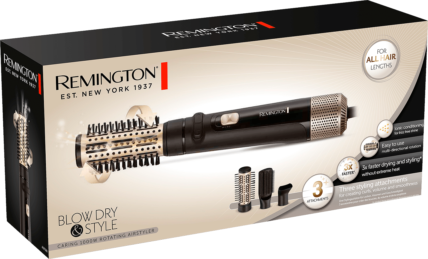 Remington Blow Dry & Style ? Caring 1000W pyörivä ilmakiharrin on täydellinen valinta sinulle, joka haluat muotoilla hiuksesi helposti ja tehokkaasti missä tahansa. Tehokas 1000 watin moottori yhdistettynä hellävaraiseen ilmavirtaan kuivaa hiukset nopeasti ilman vaurioita. Ioniteknologia vähentää sähköisyyttä ja tuo hiuksiin upean kiillon.