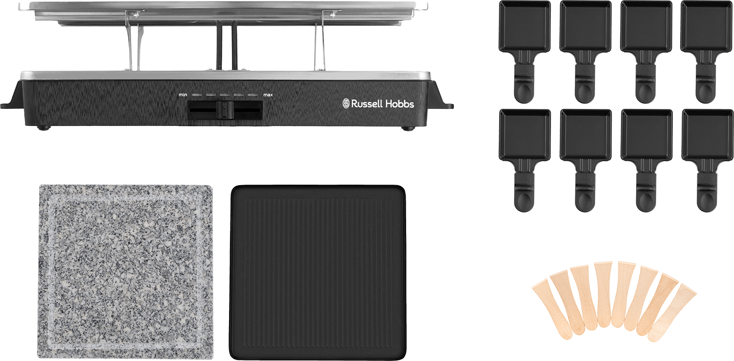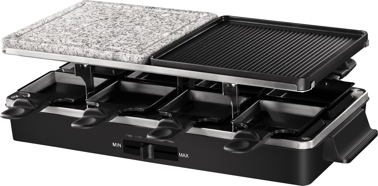 Perinteisesti Racletteen sopii myös hillosipulit, pienet etikkakurkut, ilmakuivattu kinkku ja peruna. Toinen grillilevyistä on käännettävä, jolloin grillaaminen onnistuu molemmilla puolilla. Aseta haluamasi lämpötila lämpötilansäätimestä ja odota 5-10 minuuttia (kivilevyn lämpeneminen kestää kauemmin) Kun Raclette-levy on kuumentunut voitele grillilevy hieman ruokaöljyllä tai ruokarasvalla ennen ruoan asettamista. Raclette-grillin kaikki irtonaiset osat voidaan pestä astianpesukoneessa.