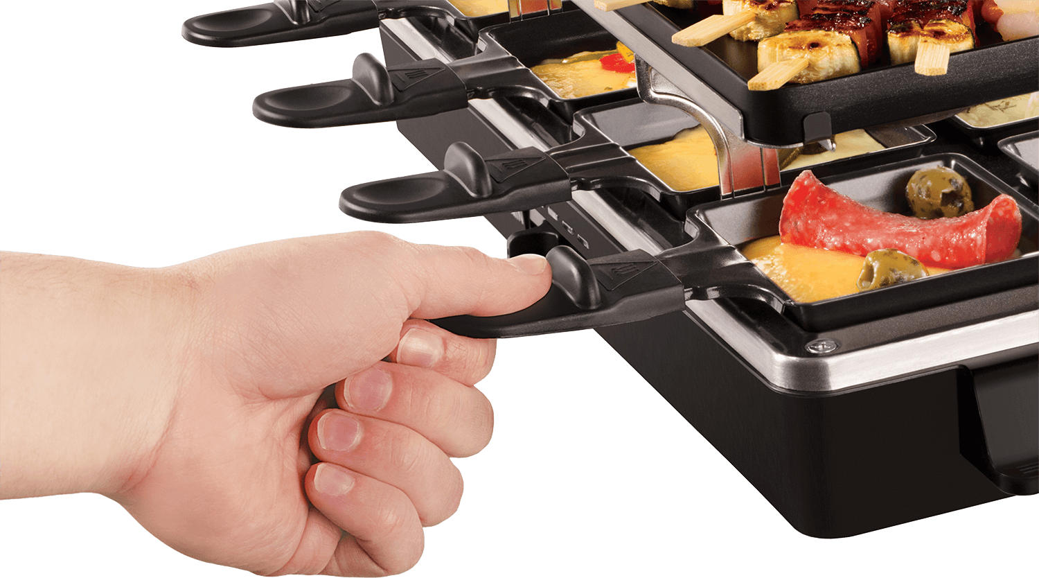 Mukana on 8 raclette-pannua. Pannuja on miellyttävä käsitellä, sillä niiden kahvaosat eivät kuumene ja niissä on tarttumaton pinnoite. Raclette-pannulla herkullinen juusto sulaa hetkessä. Juustoja voi olla useita erilaisia. Ihan oma racletteen tarkoitettu juusto, mutta myös lukuisat muut juustot soveltuvat erinomaisesti mm. kermajuustot ja emmental. Sulaneeseen juustoon voi dipata leipää ja muita ruoka-aineita.